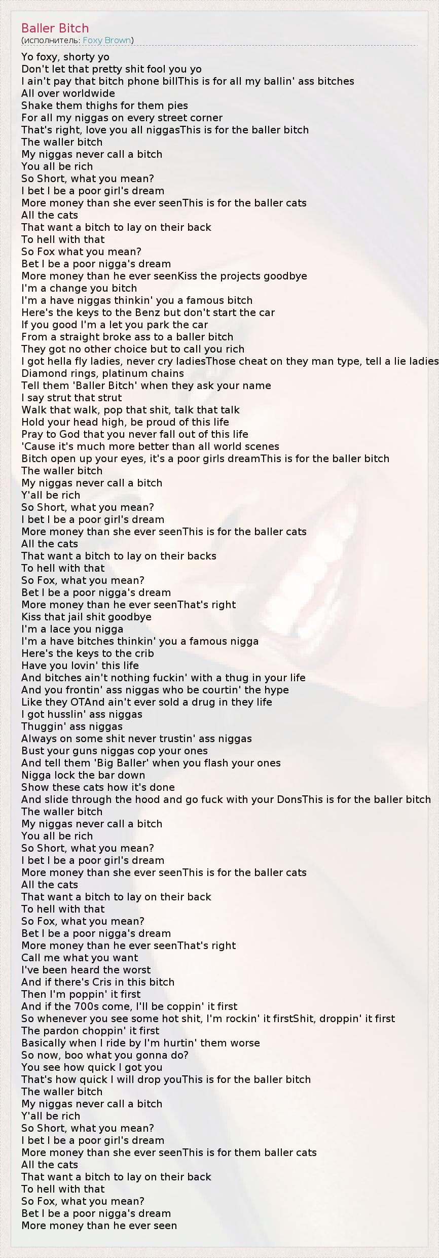 Yo foxy, shorty yo Don't let that pretty shit fool you yo I ain't pay that bitch phone billThis is for all my ballin' ass bitches All over worldwide Shake them thighs for them pies For all my niggas on every street corner That's right, love you all niggasThis is for the baller bitch The waller bitch My niggas never call a bitch You all be rich So Short, what you mean? I bet I be a poor girl's dream More money than she ever seenThis is for the baller cats All the cats That want a bitch to lay on their back To hell with that So Fox what you mean? Bet I be a poor nigga's dream More money than he ever seenKiss the projects goodbye I'm a change you bitch I'm a have niggas thinkin' you a famous bitch Here's the keys to the Benz but don't start the car If you good I'm a let you park the car From a straight broke ass to a baller bitch They got no other choice but to call you rich I got hella fly ladies, never cry ladiesThose cheat on they man type, tell a lie ladies Diamond rings, platinum chains Tell them 'Baller Bitch' when they ask your name I say strut that strut Walk that walk, pop that shit, talk that talk Hold your head high, be proud of this life Pray to God that you never fall out of this life 'Cause it's much more better than all world scenes Bitch open up your eyes, it's a poor girls dreamThis is for the baller bitch The waller bitch My niggas never call a bitch Y'all be rich So Short, what you mean? I bet I be a poor girl's dream More money than she ever seenThis is for the baller cats All the cats That want a bitch to lay on their backs To hell with that So Fox, what you mean? Bet I be a poor nigga's dream More money than he ever seenThat's right Kiss that jail shit goodbye I'm a lace you nigga I'm a have bitches thinkin' you a famous nigga Here's the keys to the crib Have you lovin' this life And bitches ain't nothing fuckin' with a thug in your life And you frontin' ass niggas who be courtin' the hype Like they OTAnd ain't ever sold a drug in they life I got husslin' ass niggas Thuggin' ass niggas Always on some shit never trustin' ass niggas Bust your guns niggas cop your ones And tell them 'Big Baller' when you flash your ones Nigga lock the bar down Show these cats how it's done And slide through the hood and go fuck with your DonsThis is for the baller bitch The waller bitch My niggas never call a bitch You all be rich So Short, what you mean? I bet I be a poor girl's dream More money than she ever seenThis is for the baller cats All the cats That want a bitch to lay on their back To hell with that So Fox, what you mean? Bet I be a poor nigga's dream More money than he ever seenThat's right Call me what you want I've been heard the worst And if there's Cris in this bitch Then I'm poppin' it first And if the 700s come, I'll be coppin' it first So whenever you see some hot shit, I'm rockin' it firstShit, droppin' it first The pardon choppin' it first Basically when I ride by I'm hurtin' them worse So now, boo what you gonna do? You see how quick I got you That's how quick I will drop youThis is for the baller bitch The waller bitch My niggas never call a bitch Y'all be rich So Short, what you mean? I bet I be a poor girl's dream More money than she ever seenThis is for them baller cats All the cats That want a bitch to lay on their back To hell with that So Fox, what you mean? Bet I be a poor nigga's dream More money than he ever seen
