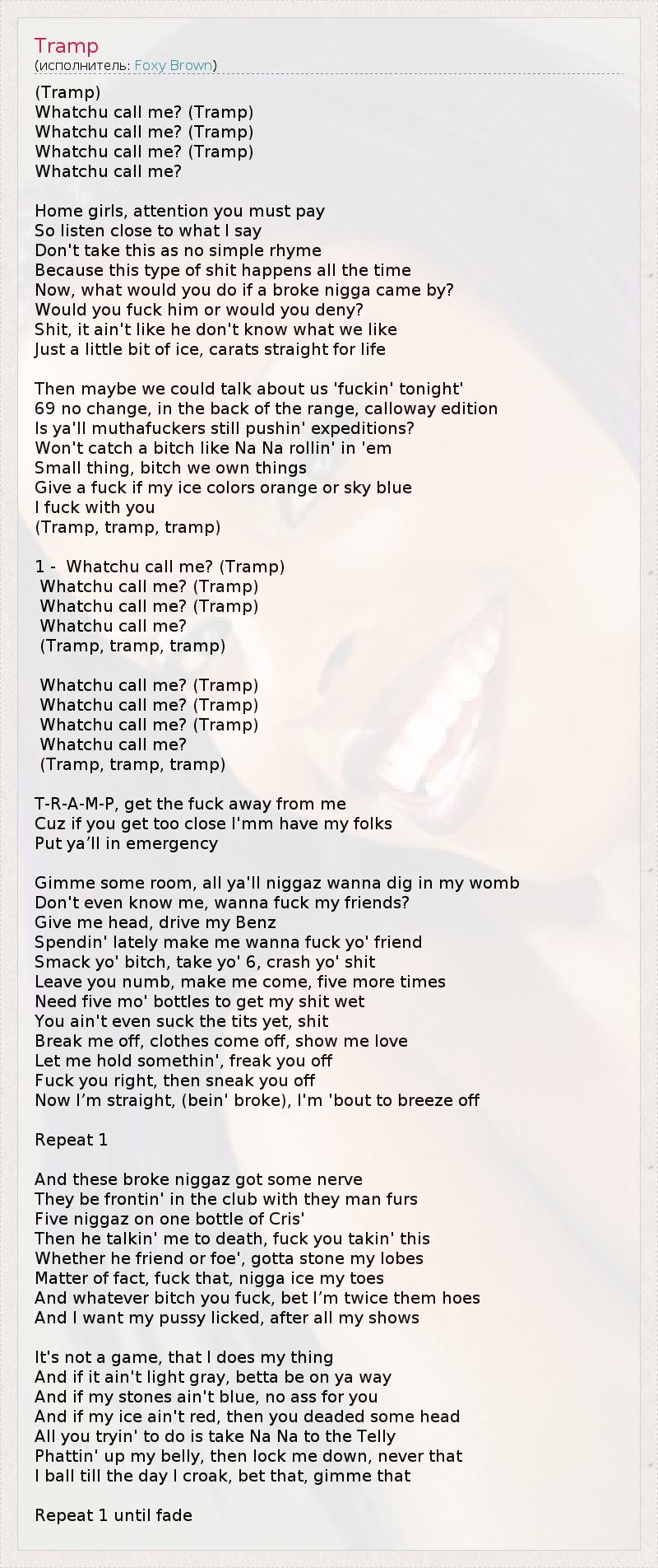 (Tramp) Whatchu call me? (Tramp) Whatchu call me? (Tramp) Whatchu call me? (Tramp) Whatchu call me? Home girls, attention you must pay So listen close to what I say Don't take this as no simple rhyme Because this type of shit happens all the time Now, what would you do if a broke nigga came by? Would you fuck him or would you deny? Shit, it ain't like he don't know what we like Just a little bit of ice, carats straight for life Then maybe we could talk about us 'fuckin' tonight' 69 no change, in the back of the range, calloway edition Is ya'll muthafuckers still pushin' expeditions? Won't catch a bitch like Na Na rollin' in 'em Small thing, bitch we own things Give a fuck if my ice colors orange or sky blue I fuck with you (Tramp, tramp, tramp) 1 - Whatchu call me? (Tramp) Whatchu call me? (Tramp) Whatchu call me? (Tramp) Whatchu call me? (Tramp, tramp, tramp) Whatchu call me? (Tramp) Whatchu call me? (Tramp) Whatchu call me? (Tramp) Whatchu call me? (Tramp, tramp, tramp) T-R-A-M-P, get the fuck away from me Cuz if you get too close I'mm have my folks Put ya’ll in emergency Gimme some room, all ya'll niggaz wanna dig in my womb Don't even know me, wanna fuck my friends? Give me head, drive my Benz Spendin' lately make me wanna fuck yo' friend Smack yo' bitch, take yo' 6, crash yo' shit Leave you numb, make me come, five more times Need five mo' bottles to get my shit wet You ain't even suck the tits yet, shit Break me off, clothes come off, show me love Let me hold somethin', freak you off Fuck you right, then sneak you off Now I’m straight, (bein' broke), I'm 'bout to breeze off Repeat 1 And these broke niggaz got some nerve They be frontin' in the club with they man furs Five niggaz on one bottle of Cris' Then he talkin' me to death, fuck you takin' this Whether he friend or foe', gotta stone my lobes Matter of fact, fuck that, nigga ice my toes And whatever bitch you fuck, bet I’m twice them hoes And I want my pussy licked, after all my shows It's not a game, that I does my thing And if it ain't light gray, betta be on ya way And if my stones ain't blue, no ass for you And if my ice ain't red, then you deaded some head All you tryin' to do is take Na Na to the Telly Phattin' up my belly, then lock me down, never that I ball till the day I croak, bet that, gimme that Repeat 1 until fade