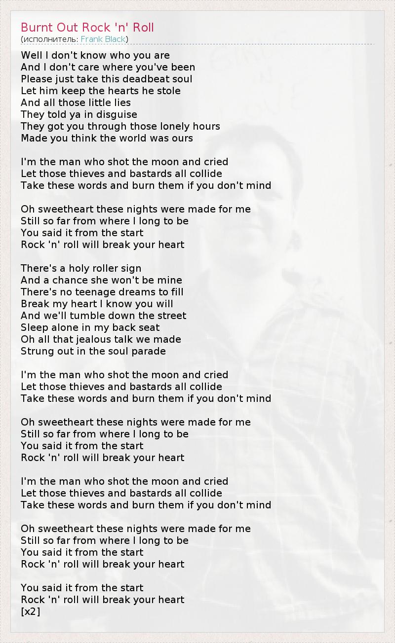 Well I don't know who you are And I don't care where you've been Please just take this deadbeat soul Let him keep the hearts he stole And all those little lies They told ya in disguise They got you through those lonely hours Made you think the world was ours I'm the man who shot the moon and cried Let those thieves and bastards all collide Take these words and burn them if you don't mind Oh sweetheart these nights were made for me Still so far from where I long to be You said it from the start Rock 'n' roll will break your heart There's a holy roller sign And a chance she won't be mine There's no teenage dreams to fill Break my heart I know you will And we'll tumble down the street Sleep alone in my back seat Oh all that jealous talk we made Strung out in the soul parade I'm the man who shot the moon and cried Let those thieves and bastards all collide Take these words and burn them if you don't mind Oh sweetheart these nights were made for me Still so far from where I long to be You said it from the start Rock 'n' roll will break your heart I'm the man who shot the moon and cried Let those thieves and bastards all collide Take these words and burn them if you don't mind Oh sweetheart these nights were made for me Still so far from where I long to be You said it from the start Rock 'n' roll will break your heart You said it from the start Rock 'n' roll will break your heart [x2]