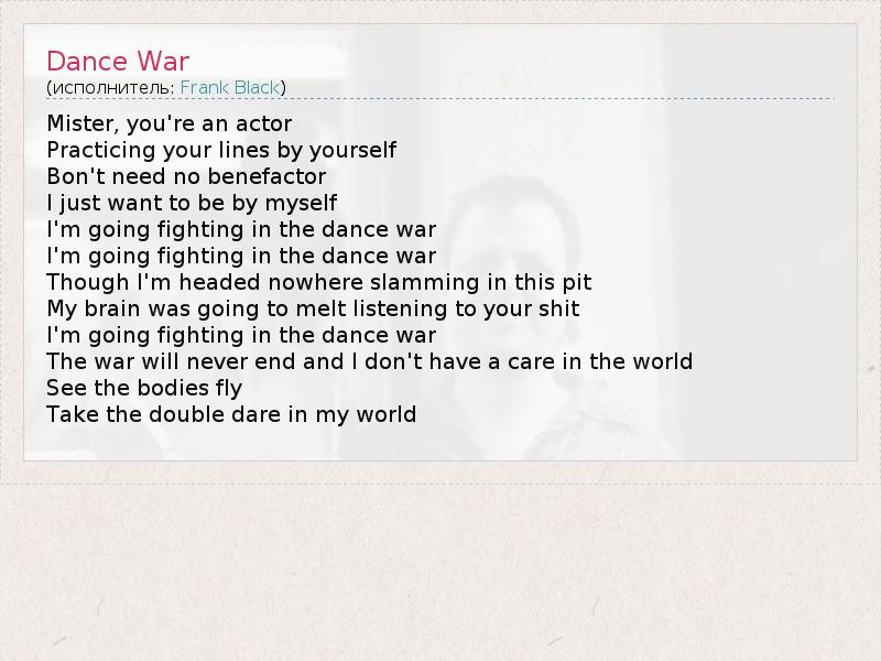 Mister, you're an actor Practicing your lines by yourself Bon't need no benefactor I just want to be by myself I'm going fighting in the dance war I'm going fighting in the dance war Though I'm headed nowhere slamming in this pit My brain was going to melt listening to your shit I'm going fighting in the dance war The war will never end and I don't have a care in the world See the bodies fly Take the double dare in my world