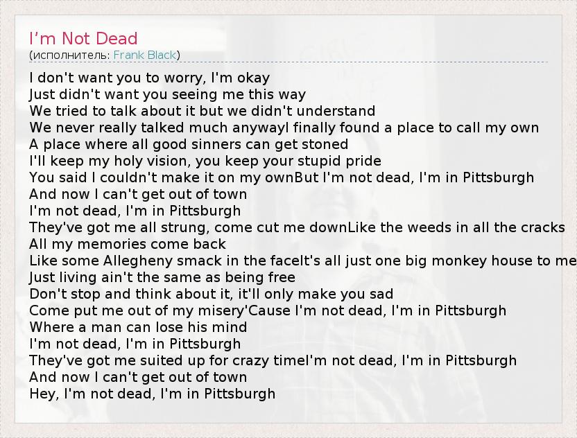 Come put me out of my misery'Cause I'm not dead, I'm in Pittsburgh