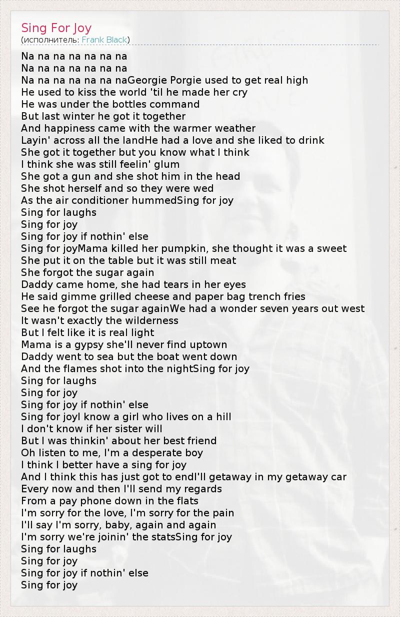 Na na na na na na na Na na na na na na na Na na na na na na naGeorgie Porgie used to get real high He used to kiss the world 'til he made her cry He was under the bottles command But last winter he got it together And happiness came with the warmer weather Layin' across all the landHe had a love and she liked to drink She got it together but you know what I think I think she was still feelin' glum She got a gun and she shot him in the head She shot herself and so they were wed As the air conditioner hummedSing for joy Sing for laughs Sing for joy Sing for joy if nothin' else Sing for joyMama killed her pumpkin, she thought it was a sweet She put it on the table but it was still meat She forgot the sugar again Daddy came home, she had tears in her eyes He said gimme grilled cheese and paper bag trench fries See he forgot the sugar againWe had a wonder seven years out west It wasn't exactly the wilderness But I felt like it is real light Mama is a gypsy she'll never find uptown Daddy went to sea but the boat went down And the flames shot into the nightSing for joy Sing for laughs Sing for joy Sing for joy if nothin' else Sing for joyI know a girl who lives on a hill I don't know if her sister will But I was thinkin' about her best friend Oh listen to me, I'm a desperate boy I think I better have a sing for joy And I think this has just got to endI'll getaway in my getaway car Every now and then I'll send my regards From a pay phone down in the flats I'm sorry for the love, I'm sorry for the pain I'll say I'm sorry, baby, again and again I'm sorry we're joinin' the statsSing for joy Sing for laughs Sing for joy Sing for joy if nothin' else Sing for joy