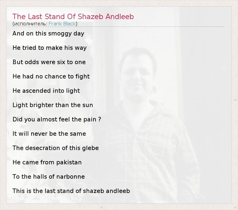 ГлавнаяИсполнителиFrank BlackThe Last Stand Of Shazeb Andleeb