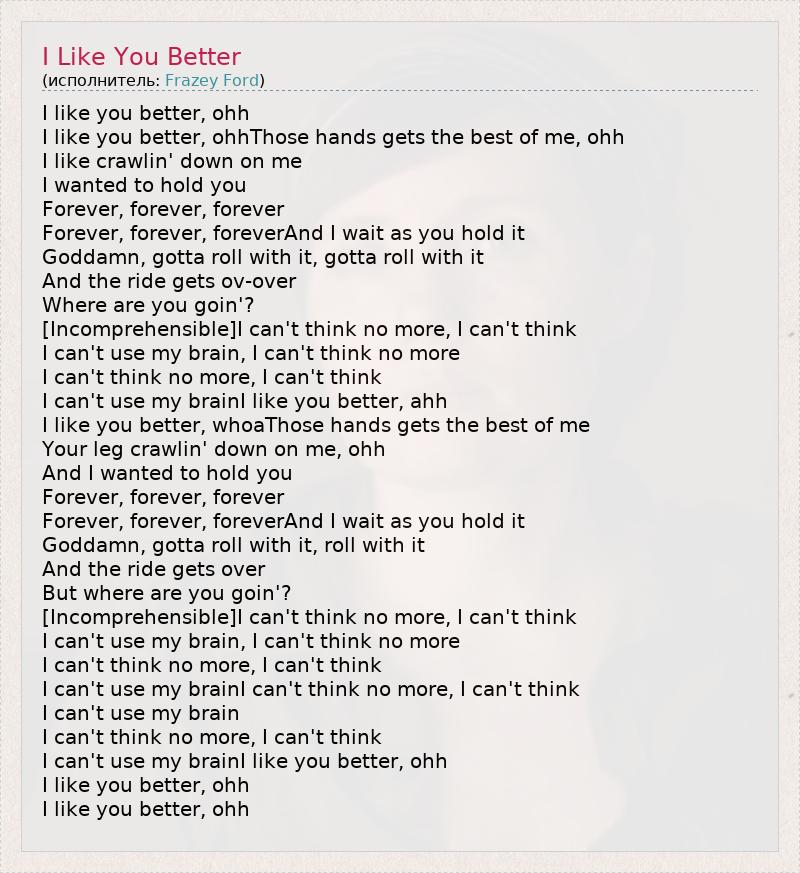 I like you better, ohh I like you better, ohhThose hands gets the best of me, ohh I like crawlin' down on me I wanted to hold you Forever, forever, forever Forever, forever, foreverAnd I wait as you hold it Goddamn, gotta roll with it, gotta roll with it And the ride gets ov-over Where are you goin'? [Incomprehensible]I can't think no more, I can't think I can't use my brain, I can't think no more I can't think no more, I can't think I can't use my brainI like you better, ahh I like you better, whoaThose hands gets the best of me Your leg crawlin' down on me, ohh And I wanted to hold you Forever, forever, forever Forever, forever, foreverAnd I wait as you hold it Goddamn, gotta roll with it, roll with it And the ride gets over But where are you goin'? [Incomprehensible]I can't think no more, I can't think I can't use my brain, I can't think no more I can't think no more, I can't think I can't use my brainI can't think no more, I can't think I can't use my brain I can't think no more, I can't think I can't use my brainI like you better, ohh I like you better, ohh I like you better, ohh