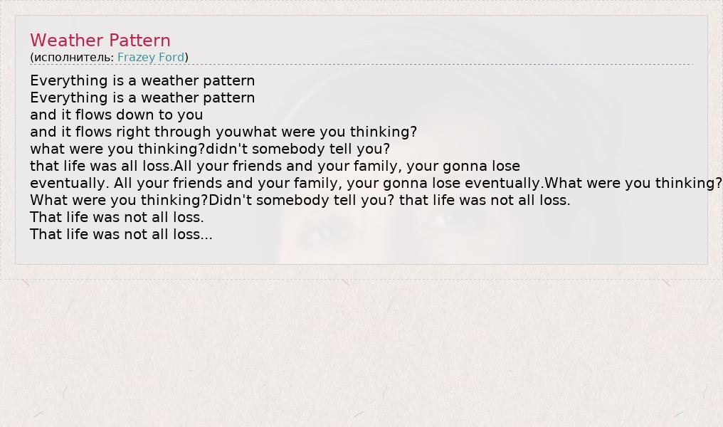 Everything is a weather pattern Everything is a weather pattern and it flows down to you and it flows right through youwhat were you thinking? what were you thinking?didn't somebody tell you? that life was all loss.All your friends and your family, your gonna lose eventually. All your friends and your family, your gonna lose eventually.What were you thinking? What were you thinking?Didn't somebody tell you? that life was not all loss. That life was not all loss. That life was not all loss...