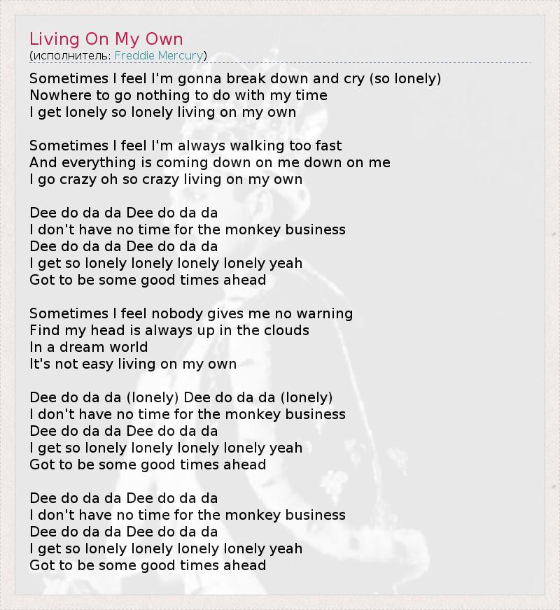Sometimes I feel I'm gonna break down and cry (so lonely) Nowhere to go nothing to do with my time I get lonely so lonely living on my own Sometimes I feel I'm always walking too fast And everything is coming down on me down on me I go crazy oh so crazy living on my own Dee do da da Dee do da da I don't have no time for the monkey business Dee do da da Dee do da da I get so lonely lonely lonely lonely yeah Got to be some good times ahead Sometimes I feel nobody gives me no warning Find my head is always up in the clouds In a dream world It's not easy living on my own Dee do da da (lonely) Dee do da da (lonely) I don't have no time for the monkey business Dee do da da Dee do da da I get so lonely lonely lonely lonely yeah Got to be some good times ahead Dee do da da Dee do da da I don't have no time for the monkey business Dee do da da Dee do da da I get so lonely lonely lonely lonely yeah Got to be some good times ahead