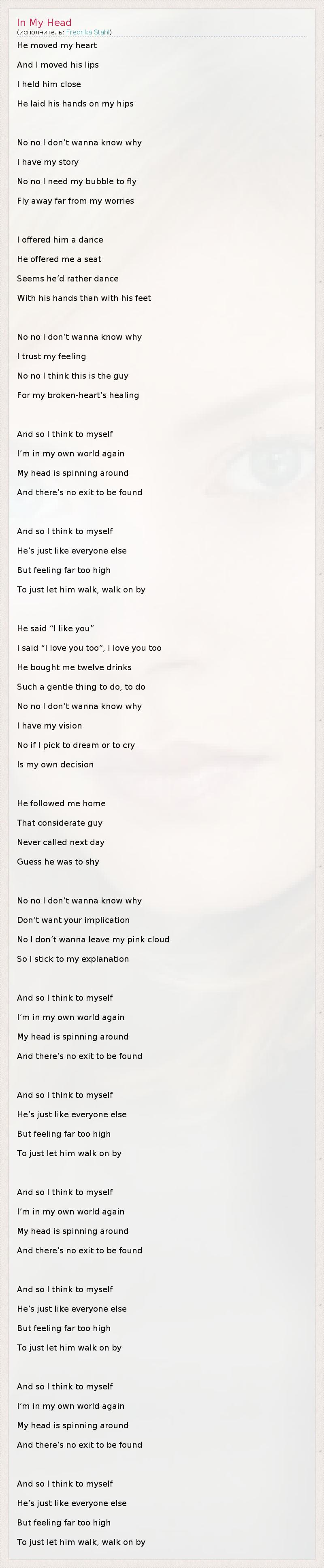 He moved my heart And I moved his lips I held him close He laid his hands on my hips No no I don’t wanna know why I have my story No no I need my bubble to fly Fly away far from my worries I offered him a dance He offered me a seat Seems he’d rather dance With his hands than with his feet No no I don’t wanna know why I trust my feeling No no I think this is the guy For my broken-heart’s healing And so I think to myself I’m in my own world again My head is spinning around And there’s no exit to be found And so I think to myself He’s just like everyone else But feeling far too high To just let him walk, walk on by He said “I like you” I said “I love you too”, I love you too He bought me twelve drinks Such a gentle thing to do, to do No no I don’t wanna know why I have my vision No if I pick to dream or to cry Is my own decision He followed me home That considerate guy Never called next day Guess he was to shy No no I don’t wanna know why Don’t want your implication No I don’t wanna leave my pink cloud So I stick to my explanation And so I think to myself I’m in my own world again My head is spinning around And there’s no exit to be found And so I think to myself He’s just like everyone else But feeling far too high To just let him walk on by And so I think to myself I’m in my own world again My head is spinning around And there’s no exit to be found And so I think to myself He’s just like everyone else But feeling far too high To just let him walk on by And so I think to myself I’m in my own world again My head is spinning around And there’s no exit to be found And so I think to myself He’s just like everyone else But feeling far too high To just let him walk, walk on by