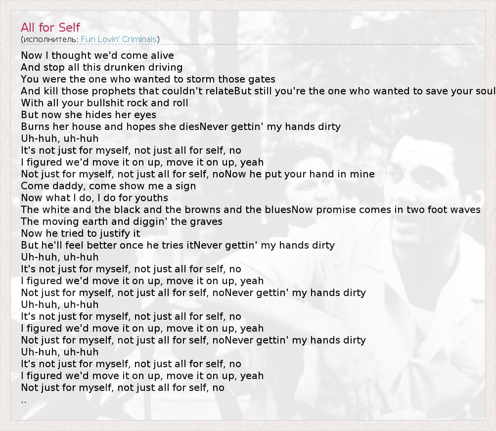 Now I thought we'd come alive And stop all this drunken driving You were the one who wanted to storm those gates And kill those prophets that couldn't relateBut still you're the one who wanted to save your soul With all your bullshit rock and roll But now she hides her eyes Burns her house and hopes she diesNever gettin' my hands dirty Uh-huh, uh-huh It's not just for myself, not just all for self, no I figured we'd move it on up, move it on up, yeah Not just for myself, not just all for self, noNow he put your hand in mine Come daddy, come show me a sign Now what I do, I do for youths The white and the black and the browns and the bluesNow promise comes in two foot waves The moving earth and diggin' the graves Now he tried to justify it But he'll feel better once he tries itNever gettin' my hands dirty Uh-huh, uh-huh It's not just for myself, not just all for self, no I figured we'd move it on up, move it on up, yeah Not just for myself, not just all for self, noNever gettin' my hands dirty Uh-huh, uh-huh It's not just for myself, not just all for self, no I figured we'd move it on up, move it on up, yeah Not just for myself, not just all for self, noNever gettin' my hands dirty Uh-huh, uh-huh It's not just for myself, not just all for self, no I figured we'd move it on up, move it on up, yeah Not just for myself, not just all for self, no ..