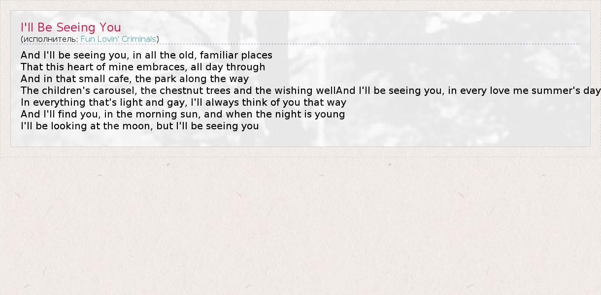 And I'll be seeing you, in all the old, familiar places That this heart of mine embraces, all day through And in that small cafe, the park along the way The children's carousel, the chestnut trees and the wishing wellAnd I'll be seeing you, in every love me summer's day In everything that's light and gay, I'll always think of you that way And I'll find you, in the morning sun, and when the night is young I'll be looking at the moon, but I'll be seeing you