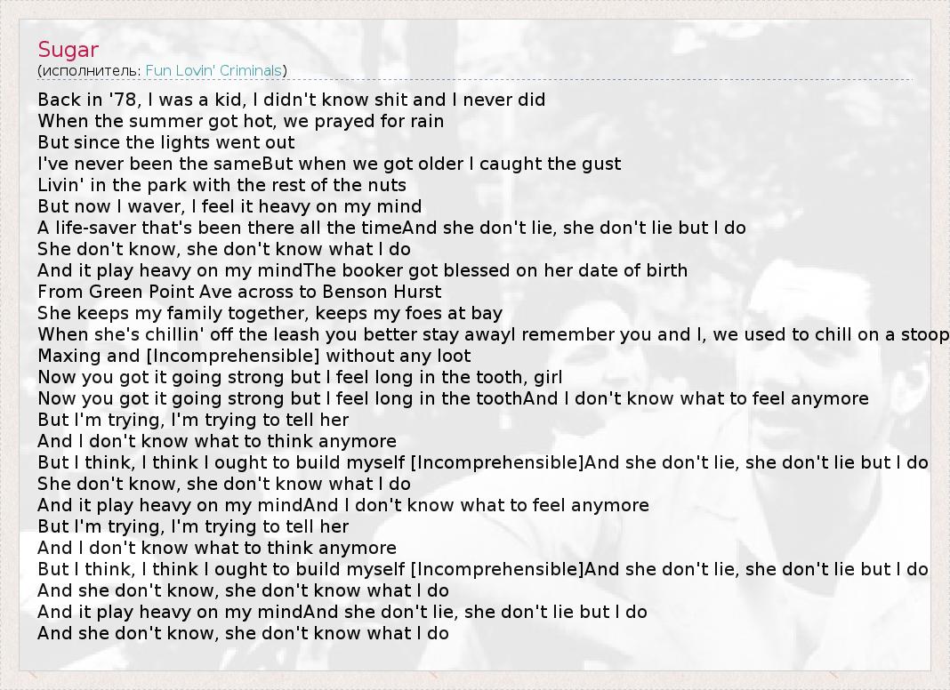And it play heavy on my mindAnd she don't lie, she don't lie but I do
