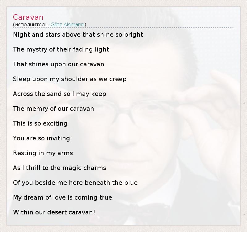Night and stars above that shine so bright The mystry of their fading light That shines upon our caravan Sleep upon my shoulder as we creep Across the sand so I may keep The memry of our caravan This is so exciting You are so inviting Resting in my arms As I thrill to the magic charms Of you beside me here beneath the blue My dream of love is coming true Within our desert caravan!