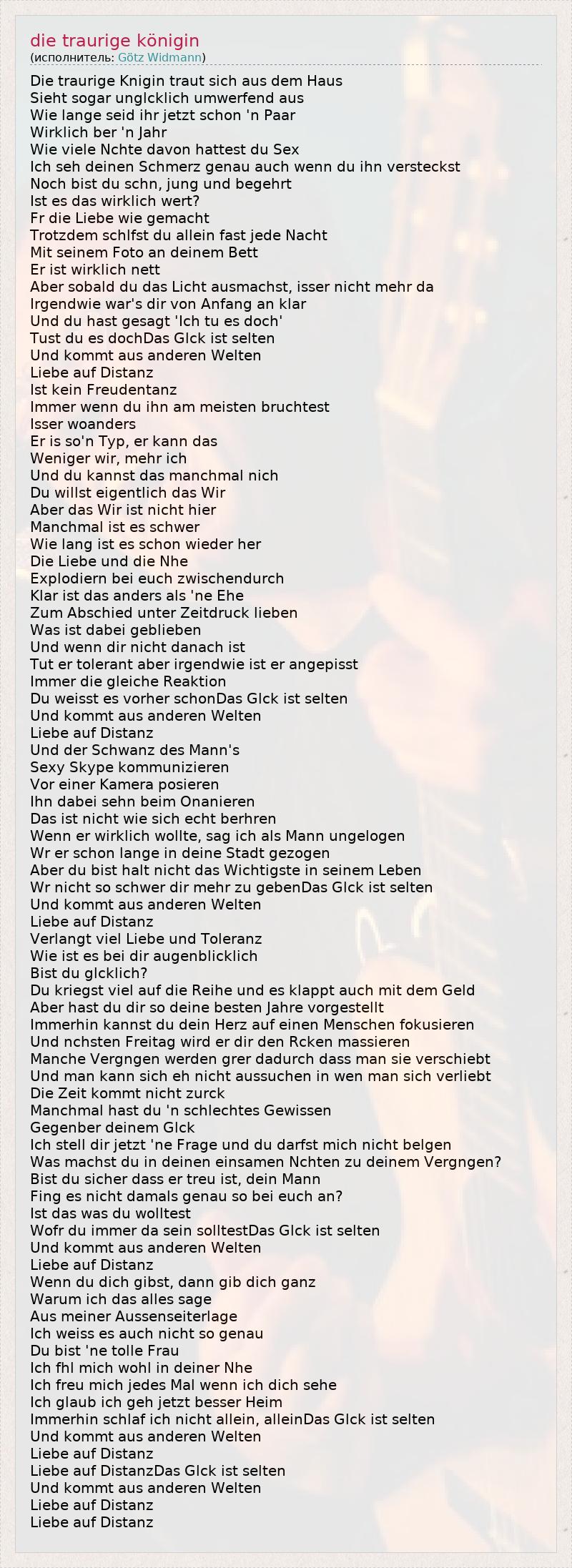 Die traurige Knigin traut sich aus dem Haus Sieht sogar unglcklich umwerfend aus Wie lange seid ihr jetzt schon 'n Paar Wirklich ber 'n Jahr Wie viele Nchte davon hattest du Sex Ich seh deinen Schmerz genau auch wenn du ihn versteckst Noch bist du schn, jung und begehrt Ist es das wirklich wert? Fr die Liebe wie gemacht Trotzdem schlfst du allein fast jede Nacht Mit seinem Foto an deinem Bett Er ist wirklich nett Aber sobald du das Licht ausmachst, isser nicht mehr da Irgendwie war's dir von Anfang an klar Und du hast gesagt 'Ich tu es doch' Tust du es dochDas Glck ist selten Und kommt aus anderen Welten Liebe auf Distanz Ist kein Freudentanz Immer wenn du ihn am meisten bruchtest Isser woanders Er is so'n Typ, er kann das Weniger wir, mehr ich Und du kannst das manchmal nich Du willst eigentlich das Wir Aber das Wir ist nicht hier Manchmal ist es schwer Wie lang ist es schon wieder her Die Liebe und die Nhe Explodiern bei euch zwischendurch Klar ist das anders als 'ne Ehe Zum Abschied unter Zeitdruck lieben Was ist dabei geblieben Und wenn dir nicht danach ist Tut er tolerant aber irgendwie ist er angepisst Immer die gleiche Reaktion Du weisst es vorher schonDas Glck ist selten Und kommt aus anderen Welten Liebe auf Distanz Und der Schwanz des Mann's Sexy Skype kommunizieren Vor einer Kamera posieren Ihn dabei sehn beim Onanieren Das ist nicht wie sich echt berhren Wenn er wirklich wollte, sag ich als Mann ungelogen Wr er schon lange in deine Stadt gezogen Aber du bist halt nicht das Wichtigste in seinem Leben Wr nicht so schwer dir mehr zu gebenDas Glck ist selten Und kommt aus anderen Welten Liebe auf Distanz Verlangt viel Liebe und Toleranz Wie ist es bei dir augenblicklich Bist du glcklich? Du kriegst viel auf die Reihe und es klappt auch mit dem Geld Aber hast du dir so deine besten Jahre vorgestellt Immerhin kannst du dein Herz auf einen Menschen fokusieren Und nchsten Freitag wird er dir den Rcken massieren Manche Vergngen werden grer dadurch dass man sie verschiebt Und man kann sich eh nicht aussuchen in wen man sich verliebt Die Zeit kommt nicht zurck Manchmal hast du 'n schlechtes Gewissen Gegenber deinem Glck Ich stell dir jetzt 'ne Frage und du darfst mich nicht belgen Was machst du in deinen einsamen Nchten zu deinem Vergngen? Bist du sicher dass er treu ist, dein Mann Fing es nicht damals genau so bei euch an? Ist das was du wolltest Wofr du immer da sein solltestDas Glck ist selten Und kommt aus anderen Welten Liebe auf Distanz Wenn du dich gibst, dann gib dich ganz Warum ich das alles sage Aus meiner Aussenseiterlage Ich weiss es auch nicht so genau Du bist 'ne tolle Frau Ich fhl mich wohl in deiner Nhe Ich freu mich jedes Mal wenn ich dich sehe Ich glaub ich geh jetzt besser Heim Immerhin schlaf ich nicht allein, alleinDas Glck ist selten Und kommt aus anderen Welten Liebe auf Distanz Liebe auf DistanzDas Glck ist selten Und kommt aus anderen Welten Liebe auf Distanz Liebe auf Distanz