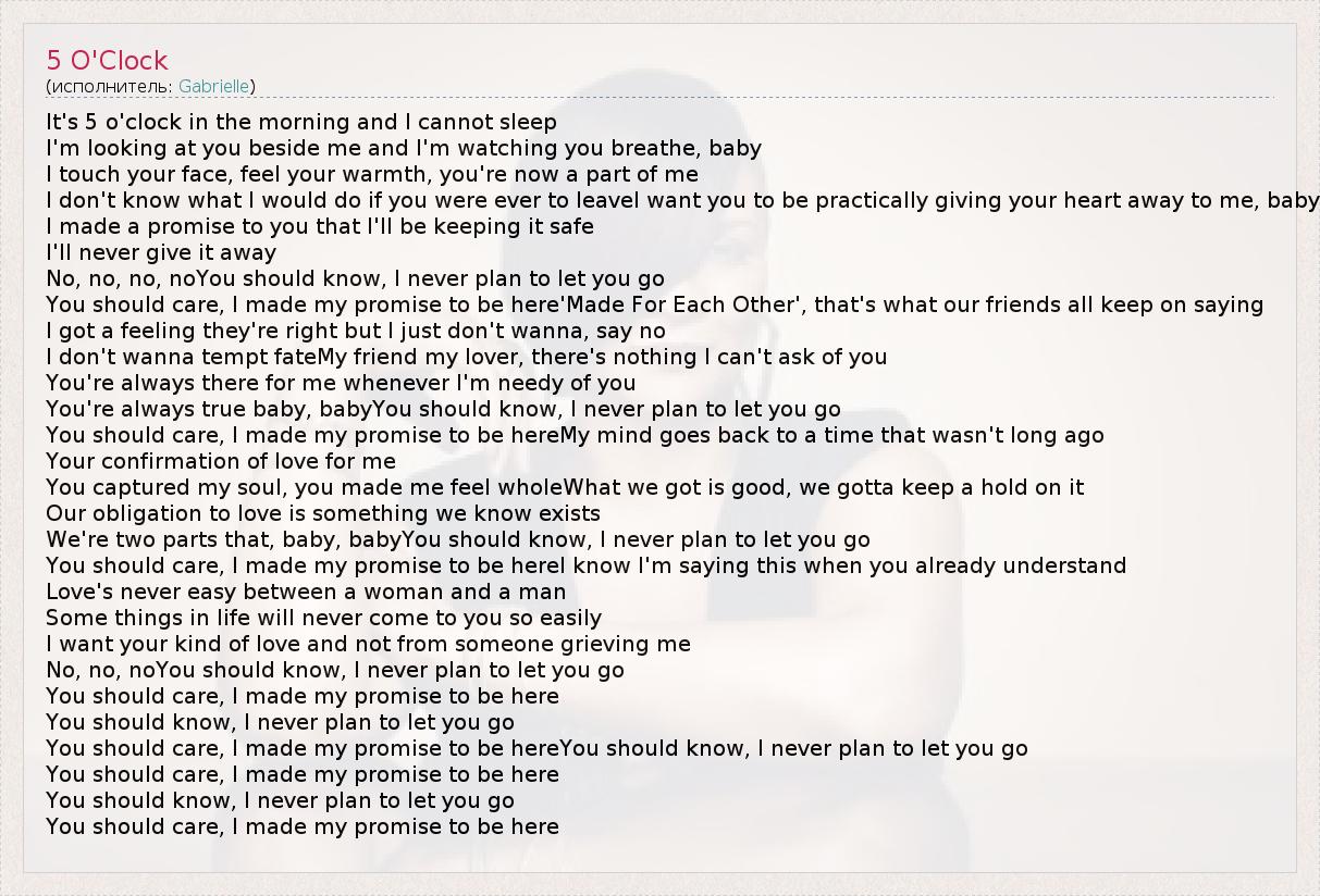 It's 5 o'clock in the morning and I cannot sleep I'm looking at you beside me and I'm watching you breathe, baby I touch your face, feel your warmth, you're now a part of me I don't know what I would do if you were ever to leaveI want you to be practically giving your heart away to me, baby I made a promise to you that I'll be keeping it safe I'll never give it away No, no, no, noYou should know, I never plan to let you go You should care, I made my promise to be here'Made For Each Other', that's what our friends all keep on saying I got a feeling they're right but I just don't wanna, say no I don't wanna tempt fateMy friend my lover, there's nothing I can't ask of you You're always there for me whenever I'm needy of you You're always true baby, babyYou should know, I never plan to let you go You should care, I made my promise to be hereMy mind goes back to a time that wasn't long ago Your confirmation of love for me You captured my soul, you made me feel wholeWhat we got is good, we gotta keep a hold on it Our obligation to love is something we know exists We're two parts that, baby, babyYou should know, I never plan to let you go You should care, I made my promise to be hereI know I'm saying this when you already understand Love's never easy between a woman and a man Some things in life will never come to you so easily I want your kind of love and not from someone grieving me No, no, noYou should know, I never plan to let you go You should care, I made my promise to be here You should know, I never plan to let you go You should care, I made my promise to be hereYou should know, I never plan to let you go You should care, I made my promise to be here You should know, I never plan to let you go You should care, I made my promise to be here