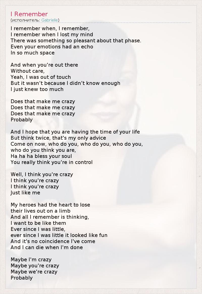 Я помню, когда… Я помню… Я помню, когда я сошёл с ума, В этом состоянии было даже что-то приятное. Даже твои эмоции отражались эхом В безграничном пространстве. Когда ты где-то там, Далеко от забот… Да, я не имел представления ни о чём, Но не потому, что я ничего не знал, А совсем наоборот, я знал слишком много… Разве это делает меня сумасшедшим? Разве это делает меня сумасшедшим? Разве это делает меня сумасшедшим? Возможно… Надеюсь, ты наслаждаешься жизнью. Но, мой совет тебе, не принимай скоропалительных решений. Ты, кого ты, кого ты, Кого ты из себя возомнил? Ха-ха-ха, Господь с тобой, Ты, правда, думаешь, что ты в своём уме! А я думаю, что ты сумасшедший. Я думаю, что ты сумасшедший. Я думаю, что ты сумасшедший, Совсем как я. Моим героям хватало смелости Рисковать жизнью и умирать. И я помню лишь то, Как хотел быть похожим на них. Впоследствии всю жизнь… Впоследствии всю жизнь мне казалось это забавным. Нет ничего случайного в том, что я пришёл в этот мир. И я умру, когда выполню своё предназначение. Возможно, я сумасшедший, Возможно, ты сумасшедший, Возможно, мы сумасшедшие… Возможно…