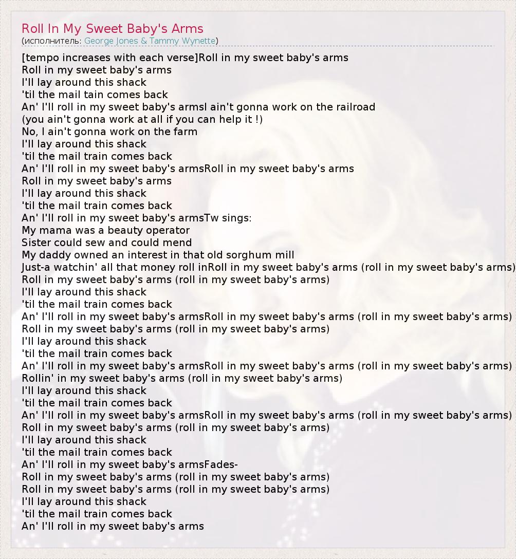 [tempo increases with each verse]Roll in my sweet baby's arms Roll in my sweet baby's arms I'll lay around this shack 'til the mail tain comes back An' I'll roll in my sweet baby's armsI ain't gonna work on the railroad (you ain't gonna work at all if you can help it !) No, I ain't gonna work on the farm I'll lay around this shack 'til the mail train comes back An' I'll roll in my sweet baby's armsRoll in my sweet baby's arms Roll in my sweet baby's arms I'll lay around this shack 'til the mail train comes back An' I'll roll in my sweet baby's armsTw sings: My mama was a beauty operator Sister could sew and could mend My daddy owned an interest in that old sorghum mill Just-a watchin' all that money roll inRoll in my sweet baby's arms (roll in my sweet baby's arms) Roll in my sweet baby's arms (roll in my sweet baby's arms) I'll lay around this shack 'til the mail train comes back An' I'll roll in my sweet baby's armsRoll in my sweet baby's arms (roll in my sweet baby's arms) Roll in my sweet baby's arms (roll in my sweet baby's arms) I'll lay around this shack 'til the mail train comes back An' I'll roll in my sweet baby's armsRoll in my sweet baby's arms (roll in my sweet baby's arms) Rollin' in my sweet baby's arms (roll in my sweet baby's arms) I'll lay around this shack 'til the mail train comes back An' I'll roll in my sweet baby's armsRoll in my sweet baby's arms (roll in my sweet baby's arms) Roll in my sweet baby's arms (roll in my sweet baby's arms) I'll lay around this shack 'til the mail train comes back An' I'll roll in my sweet baby's armsFades- Roll in my sweet baby's arms (roll in my sweet baby's arms) Roll in my sweet baby's arms (roll in my sweet baby's arms) I'll lay around this shack 'til the mail train comes back An' I'll roll in my sweet baby's arms