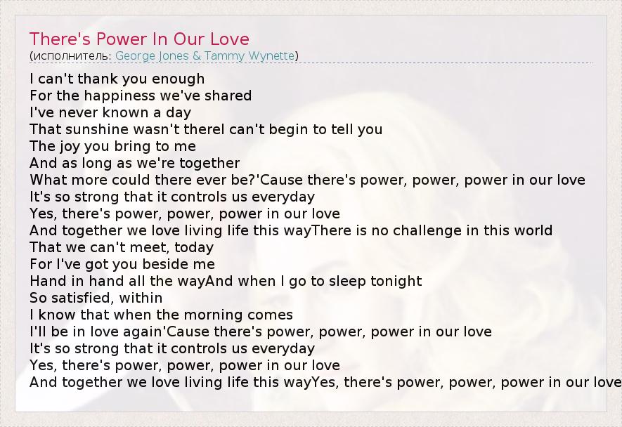 I can't thank you enough For the happiness we've shared I've never known a day That sunshine wasn't thereI can't begin to tell you The joy you bring to me And as long as we're together What more could there ever be?'Cause there's power, power, power in our love It's so strong that it controls us everyday Yes, there's power, power, power in our love And together we love living life this wayThere is no challenge in this world That we can't meet, today For I've got you beside me Hand in hand all the wayAnd when I go to sleep tonight So satisfied, within I know that when the morning comes I'll be in love again'Cause there's power, power, power in our love It's so strong that it controls us everyday Yes, there's power, power, power in our love And together we love living life this wayYes, there's power, power, power in our love