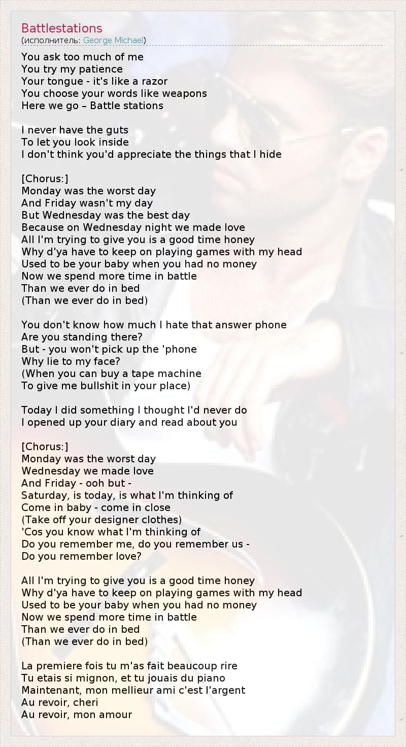 You ask too much of me You try my patience Your tongue - it's like a razor You choose your words like weapons Here we go – Battle stations I never have the guts To let you look inside I don't think you'd appreciate the things that I hide [Chorus:] Monday was the worst day And Friday wasn't my day But Wednesday was the best day Because on Wednesday night we made love All I'm trying to give you is a good time honey Why d'ya have to keep on playing games with my head Used to be your baby when you had no money Now we spend more time in battle Than we ever do in bed (Than we ever do in bed) You don't know how much I hate that answer phone Are you standing there? But - you won't pick up the 'phone Why lie to my face? (When you can buy a tape machine To give me bullshit in your place) Today I did something I thought I'd never do I opened up your diary and read about you [Chorus:] Monday was the worst day Wednesday we made love And Friday - ooh but - Saturday, is today, is what I'm thinking of Come in baby - come in close (Take off your designer clothes) 'Cos you know what I'm thinking of Do you remember me, do you remember us - Do you remember love? All I'm trying to give you is a good time honey Why d'ya have to keep on playing games with my head Used to be your baby when you had no money Now we spend more time in battle Than we ever do in bed (Than we ever do in bed) La premiere fois tu m'as fait beaucoup rire Tu etais si mignon, et tu jouais du piano Maintenant, mon mellieur ami c'est l'argent Au revoir, cheri Au revoir, mon amour