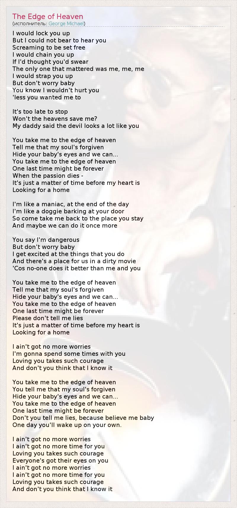 I would lock you up But I could not bear to hear you Screaming to be set free I would chain you up If I'd thought you'd swear The only one that mattered was me, me, me I would strap you up But don't worry baby You know I wouldn't hurt you 'less you wanted me to It's too late to stop Won't the heavens save me? My daddy said the devil looks a lot like you You take me to the edge of heaven Tell me that my soul's forgiven Hide your baby's eyes and we can... You take me to the edge of heaven One last time might be forever When the passion dies - It's just a matter of time before my heart is Looking for a home I'm like a maniac, at the end of the day I'm like a doggie barking at your door So come take me back to the place you stay And maybe we can do it once more You say I'm dangerous But don't worry baby I get excited at the things that you do And there's a place for us in a dirty movie 'Cos no-one does it better than me and you You take me to the edge of heaven Tell me that my soul's forgiven Hide your baby's eyes and we can... You take me to the edge of heaven One last time might be forever Please don't tell me lies It's just a matter of time before my heart is Looking for a home I ain't got no more worries I'm gonna spend some times with you Loving you takes such courage And don't you think that I know it You take me to the edge of heaven You tell me that my soul's forgiven Hide your baby's eyes and we can... You take me to the edge of heaven One last time might be forever Don't you tell me lies, because believe me baby One day you'll wake up on your own. I ain't got no more worries I ain't got no more time for you Loving you takes such courage Everyone's got their eyes on you I ain't got no more worries I ain't got no more time for you Loving you takes such courage And don't you think that I know it