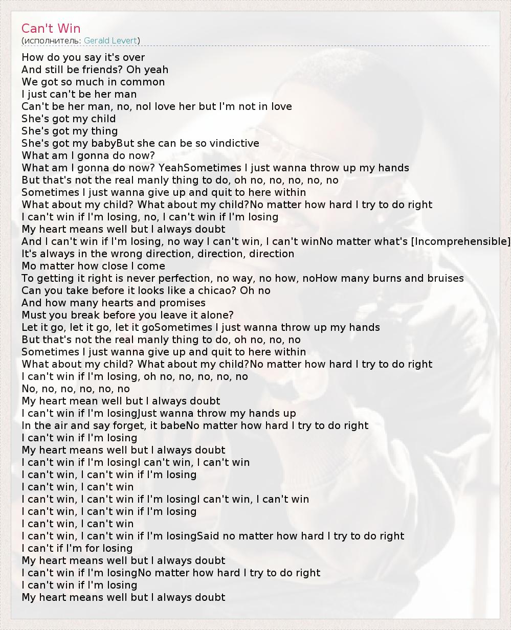 How do you say it's over And still be friends? Oh yeah We got so much in common I just can't be her man Can't be her man, no, noI love her but I'm not in love She's got my child She's got my thing She's got my babyBut she can be so vindictive What am I gonna do now? What am I gonna do now? YeahSometimes I just wanna throw up my hands But that's not the real manly thing to do, oh no, no, no, no, no Sometimes I just wanna give up and quit to here within What about my child? What about my child?No matter how hard I try to do right I can't win if I'm losing, no, I can't win if I'm losing My heart means well but I always doubt And I can't win if I'm losing, no way I can't win, I can't winNo matter what's [Incomprehensible] It's always in the wrong direction, direction, direction Mo matter how close I come To getting it right is never perfection, no way, no how, noHow many burns and bruises Can you take before it looks like a chicao? Oh no And how many hearts and promises Must you break before you leave it alone? Let it go, let it go, let it goSometimes I just wanna throw up my hands But that's not the real manly thing to do, oh no, no, no Sometimes I just wanna give up and quit to here within What about my child? What about my child?No matter how hard I try to do right I can't win if I'm losing, oh no, no, no, no, no No, no, no, no, no, no My heart mean well but I always doubt I can't win if I'm losingJust wanna throw my hands up In the air and say forget, it babeNo matter how hard I try to do right I can't win if I'm losing My heart means well but I always doubt I can't win if I'm losingI can't win, I can't win I can't win, I can't win if I'm losing I can't win, I can't win I can't win, I can't win if I'm losingI can't win, I can't win I can't win, I can't win if I'm losing I can't win, I can't win I can't win, I can't win if I'm losingSaid no matter how hard I try to do right I can't if I'm for losing My heart means well but I always doubt I can't win if I'm losingNo matter how hard I try to do right I can't win if I'm losing My heart means well but I always doubt