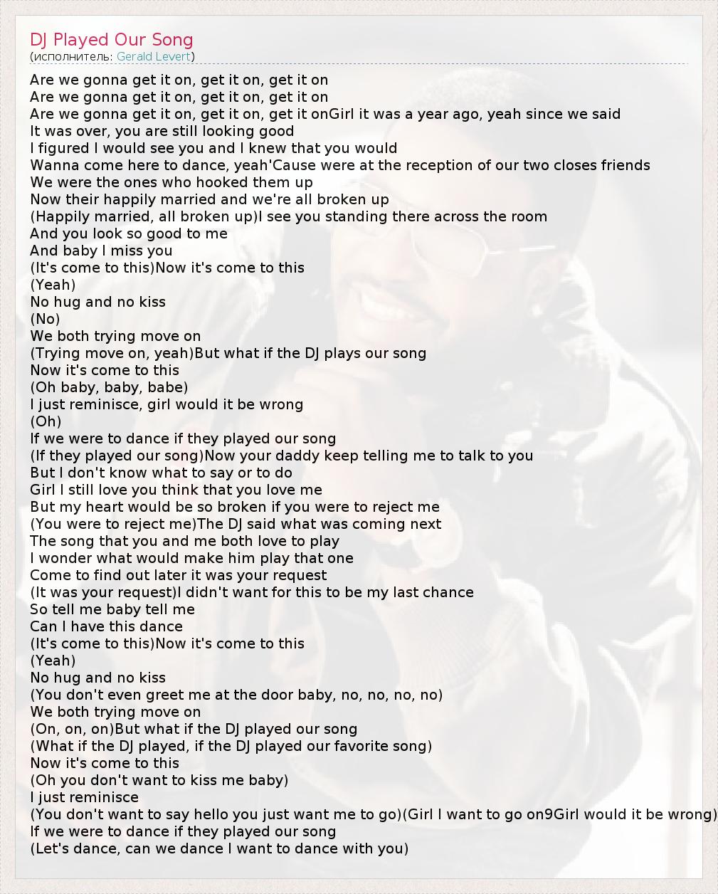 Are we gonna get it on, get it on, get it on Are we gonna get it on, get it on, get it on Are we gonna get it on, get it on, get it onGirl it was a year ago, yeah since we said It was over, you are still looking good I figured I would see you and I knew that you would Wanna come here to dance, yeah'Cause were at the reception of our two closes friends We were the ones who hooked them up Now their happily married and we're all broken up (Happily married, all broken up)I see you standing there across the room And you look so good to me And baby I miss you (It's come to this)Now it's come to this (Yeah) No hug and no kiss (No) We both trying move on (Trying move on, yeah)But what if the DJ plays our song Now it's come to this (Oh baby, baby, babe) I just reminisce, girl would it be wrong (Oh) If we were to dance if they played our song (If they played our song)Now your daddy keep telling me to talk to you But I don't know what to say or to do Girl I still love you think that you love me But my heart would be so broken if you were to reject me (You were to reject me)The DJ said what was coming next The song that you and me both love to play I wonder what would make him play that one Come to find out later it was your request (It was your request)I didn't want for this to be my last chance So tell me baby tell me Can I have this dance (It's come to this)Now it's come to this (Yeah) No hug and no kiss (You don't even greet me at the door baby, no, no, no, no) We both trying move on (On, on, on)But what if the DJ played our song (What if the DJ played, if the DJ played our favorite song) Now it's come to this (Oh you don't want to kiss me baby) I just reminisce (You don't want to say hello you just want me to go)(Girl I want to go on9Girl would it be wrong) If we were to dance if they played our song (Let's dance, can we dance I want to dance with you)