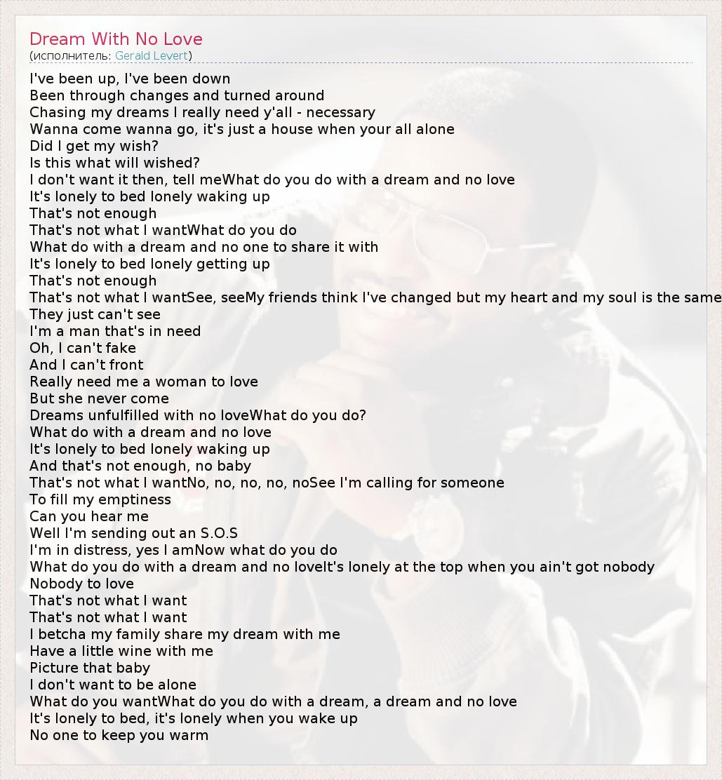 I've been up, I've been down Been through changes and turned around Chasing my dreams I really need y'all - necessary Wanna come wanna go, it's just a house when your all alone Did I get my wish? Is this what will wished? I don't want it then, tell meWhat do you do with a dream and no love It's lonely to bed lonely waking up That's not enough That's not what I wantWhat do you do What do with a dream and no one to share it with It's lonely to bed lonely getting up That's not enough That's not what I wantSee, seeMy friends think I've changed but my heart and my soul is the same They just can't see I'm a man that's in need Oh, I can't fake And I can't front Really need me a woman to love But she never come Dreams unfulfilled with no loveWhat do you do? What do with a dream and no love It's lonely to bed lonely waking up And that's not enough, no baby That's not what I wantNo, no, no, no, noSee I'm calling for someone To fill my emptiness Can you hear me Well I'm sending out an S.O.S I'm in distress, yes I amNow what do you do What do you do with a dream and no loveIt's lonely at the top when you ain't got nobody Nobody to love That's not what I want That's not what I want I betcha my family share my dream with me Have a little wine with me Picture that baby I don't want to be alone What do you wantWhat do you do with a dream, a dream and no love It's lonely to bed, it's lonely when you wake up No one to keep you warm