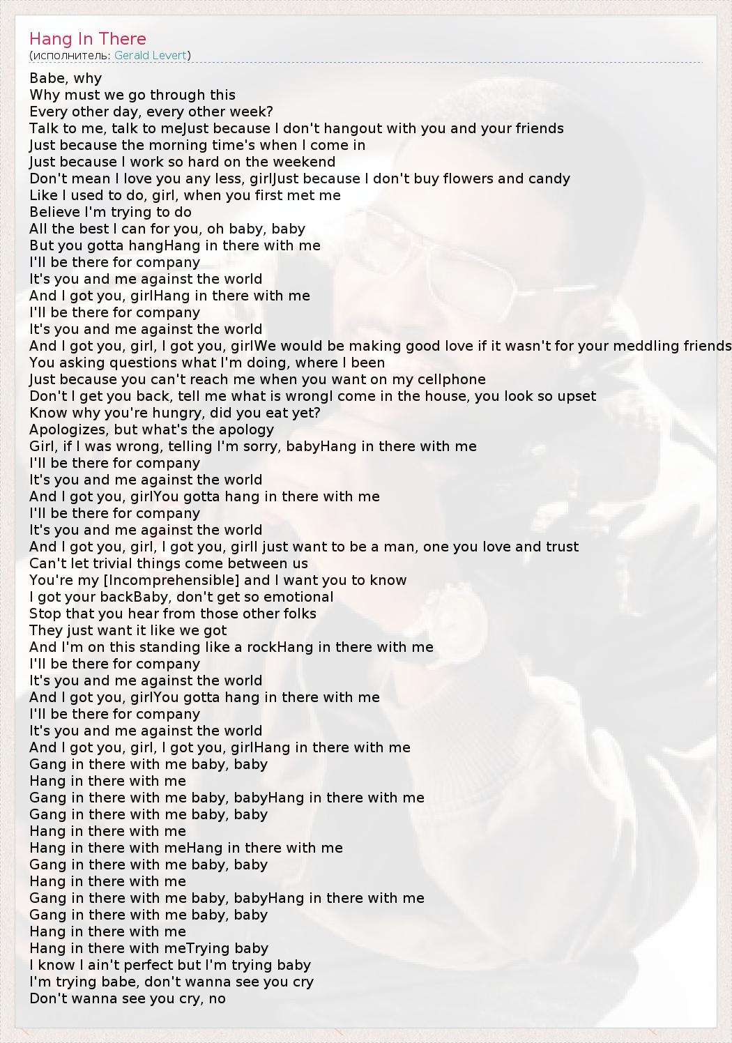 Babe, why Why must we go through this Every other day, every other week? Talk to me, talk to meJust because I don't hangout with you and your friends Just because the morning time's when I come in Just because I work so hard on the weekend Don't mean I love you any less, girlJust because I don't buy flowers and candy Like I used to do, girl, when you first met me Believe I'm trying to do All the best I can for you, oh baby, baby But you gotta hangHang in there with me I'll be there for company It's you and me against the world And I got you, girlHang in there with me I'll be there for company It's you and me against the world And I got you, girl, I got you, girlWe would be making good love if it wasn't for your meddling friends You asking questions what I'm doing, where I been Just because you can't reach me when you want on my cellphone Don't I get you back, tell me what is wrongI come in the house, you look so upset Know why you're hungry, did you eat yet? Apologizes, but what's the apology Girl, if I was wrong, telling I'm sorry, babyHang in there with me I'll be there for company It's you and me against the world And I got you, girlYou gotta hang in there with me I'll be there for company It's you and me against the world And I got you, girl, I got you, girlI just want to be a man, one you love and trust Can't let trivial things come between us You're my [Incomprehensible] and I want you to know I got your backBaby, don't get so emotional Stop that you hear from those other folks They just want it like we got And I'm on this standing like a rockHang in there with me I'll be there for company It's you and me against the world And I got you, girlYou gotta hang in there with me I'll be there for company It's you and me against the world And I got you, girl, I got you, girlHang in there with me Gang in there with me baby, baby Hang in there with me Gang in there with me baby, babyHang in there with me Gang in there with me baby, baby Hang in there with me Hang in there with meHang in there with me Gang in there with me baby, baby Hang in there with me Gang in there with me baby, babyHang in there with me Gang in there with me baby, baby Hang in there with me Hang in there with meTrying baby I know I ain't perfect but I'm trying baby I'm trying babe, don't wanna see you cry Don't wanna see you cry, no
