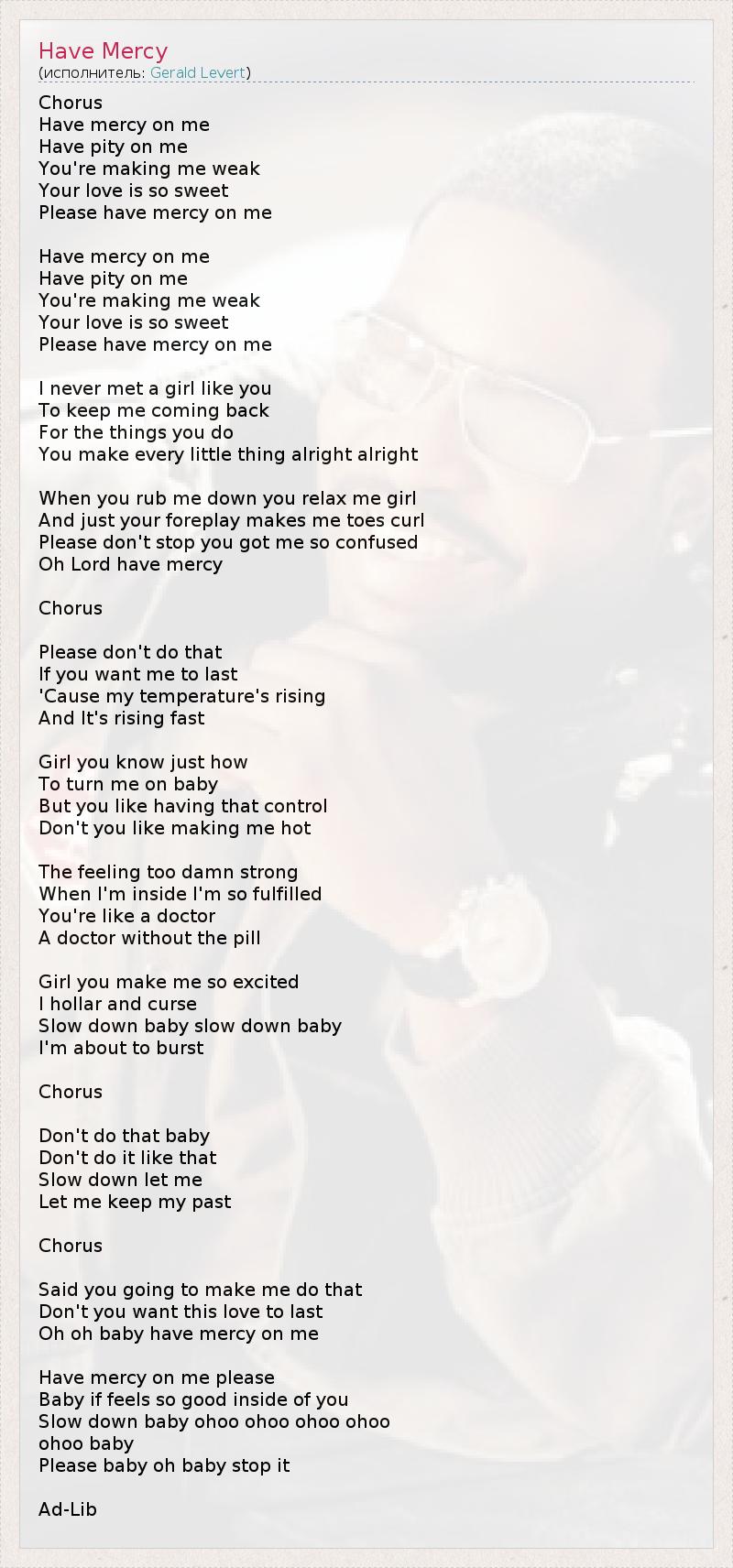 Chorus Have mercy on me Have pity on me You're making me weak Your love is so sweet Please have mercy on me Have mercy on me Have pity on me You're making me weak Your love is so sweet Please have mercy on me I never met a girl like you To keep me coming back For the things you do You make every little thing alright alright When you rub me down you relax me girl And just your foreplay makes me toes curl Please don't stop you got me so confused Oh Lord have mercy Chorus Please don't do that If you want me to last 'Cause my temperature's rising And It's rising fast Girl you know just how To turn me on baby But you like having that control Don't you like making me hot The feeling too damn strong When I'm inside I'm so fulfilled You're like a doctor A doctor without the pill Girl you make me so excited I hollar and curse Slow down baby slow down baby I'm about to burst Chorus Don't do that baby Don't do it like that Slow down let me Let me keep my past Chorus Said you going to make me do that Don't you want this love to last Oh oh baby have mercy on me Have mercy on me please Baby if feels so good inside of you Slow down baby ohoo ohoo ohoo ohoo ohoo baby Please baby oh baby stop it Ad-Lib