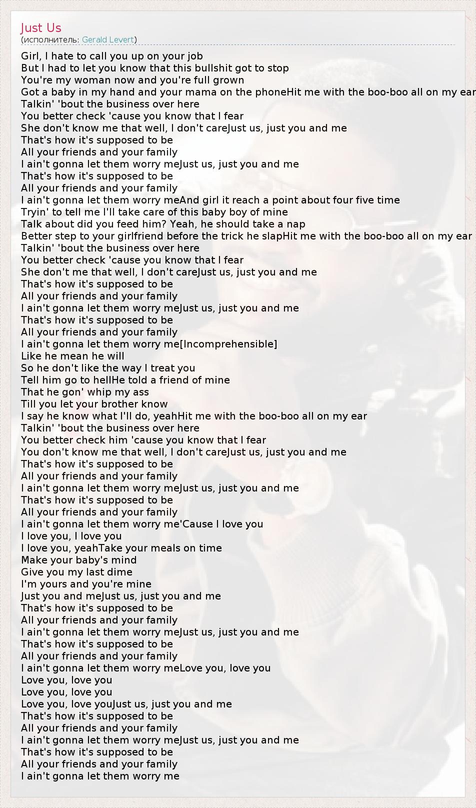 Girl, I hate to call you up on your job But I had to let you know that this bullshit got to stop You're my woman now and you're full grown Got a baby in my hand and your mama on the phoneHit me with the boo-boo all on my ear Talkin' 'bout the business over here You better check 'cause you know that I fear She don't know me that well, I don't careJust us, just you and me That's how it's supposed to be All your friends and your family I ain't gonna let them worry meJust us, just you and me That's how it's supposed to be All your friends and your family I ain't gonna let them worry meAnd girl it reach a point about four five time Tryin' to tell me I'll take care of this baby boy of mine Talk about did you feed him? Yeah, he should take a nap Better step to your girlfriend before the trick he slapHit me with the boo-boo all on my ear Talkin' 'bout the business over here You better check 'cause you know that I fear She don't me that well, I don't careJust us, just you and me That's how it's supposed to be All your friends and your family I ain't gonna let them worry meJust us, just you and me That's how it's supposed to be All your friends and your family I ain't gonna let them worry me[Incomprehensible] Like he mean he will So he don't like the way I treat you Tell him go to hellHe told a friend of mine That he gon' whip my ass Till you let your brother know I say he know what I'll do, yeahHit me with the boo-boo all on my ear Talkin' 'bout the business over here You better check him 'cause you know that I fear You don't know me that well, I don't careJust us, just you and me That's how it's supposed to be All your friends and your family I ain't gonna let them worry meJust us, just you and me That's how it's supposed to be All your friends and your family I ain't gonna let them worry me'Cause I love you I love you, I love you I love you, yeahTake your meals on time Make your baby's mind Give you my last dime I'm yours and you're mine Just you and meJust us, just you and me That's how it's supposed to be All your friends and your family I ain't gonna let them worry meJust us, just you and me That's how it's supposed to be All your friends and your family I ain't gonna let them worry meLove you, love you Love you, love you Love you, love you Love you, love youJust us, just you and me That's how it's supposed to be All your friends and your family I ain't gonna let them worry meJust us, just you and me That's how it's supposed to be All your friends and your family I ain't gonna let them worry me