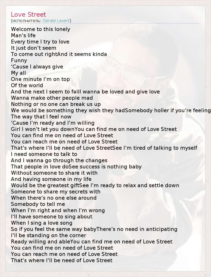 Welcome to this lonely Man's life Every time I try to love It just don't seem To come out rightAnd it seems kinda Funny 'Cause I always give My all One minute I'm on top Of the world And the next I seem to fallI wanna be loved and give love Wanna make other people mad Nothing or no one can break us up We would be something they wish they hadSomebody holler if you're feeling The way that I feel now 'Cause I'm ready and I'm willing Girl I won't let you downYou can find me on need of Love Street You can find me on need of Love Street You can reach me on need of Love Street That's where I'll be need of Love StreetSee I'm tired of talking to myself I need someone to talk to And I wanna go through the changes That people in love doSee success is nothing baby Without someone to share it with And having someone in my life Would be the greatest giftSee I'm ready to relax and settle down Someone to share my secrets with When there's no one else around Somebody to tell me When I'm right and when I'm wrong I'll have someone to sing about When I sing a love song So if you feel the same way babyThere's no need in anticipating I'll be standing on the corner Ready willing and ableYou can find me on need of Love Street You can find me on need of Love Street You can reach me on need of Love Street That's where I'll be need of Love Street