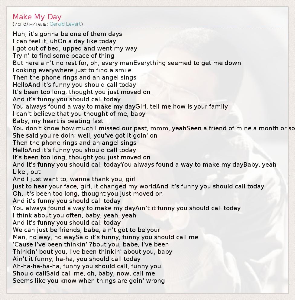 Huh, it's gonna be one of them days I can feel it, uhOn a day like today I got out of bed, upped and went my way Tryin' to find some peace of thing But here ain't no rest for, oh, every manEverything seemed to get me down Looking everywhere just to find a smile Then the phone rings and an angel sings HelloAnd it's funny you should call today It's been too long, thought you just moved on And it's funny you should call today You always found a way to make my dayGirl, tell me how is your family I can't believe that you thought of me, baby Baby, my heart is beating fast You don't know how much I missed our past, mmm, yeahSeen a friend of mine a month or so She said you're doin' well, you've got it goin' on Then the phone rings and an angel sings HelloAnd it's funny you should call today It's been too long, thought you just moved on And it's funny you should call todayYou always found a way to make my dayBaby, yeah Like , out And I just want to, wanna thank you, girl Just to hear your face, girl, it changed my worldAnd it's funny you should call today Oh, it's been too long, thought you just moved on And it's funny you should call today You always found a way to make my dayAin't it funny you should call today I think about you often, baby, yeah, yeah And it's funny you should call today We can just be friends, babe, ain't got to be your Man, no way, no waySaid it's funny, funny you should call me 'Cause I've been thinkin' ?bout you, babe, I've been Thinkin' bout you, I've been thinkin' about you, baby Ain't it funny, ha-ha, you should call today Ah-ha-ha-ha-ha, funny you should call, funny you Should callSaid call me, oh, baby, now, call me Seems like you know when things are goin' wrong