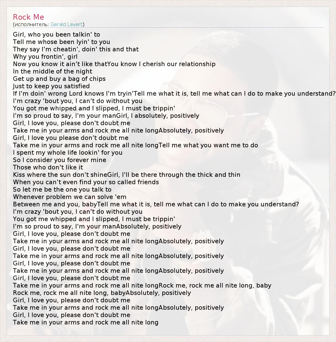 Girl, who you been talkin' to Tell me whose been lyin' to you They say I'm cheatin', doin' this and that Why you frontin', girl Now you know it ain't like thatYou know I cherish our relationship In the middle of the night Get up and buy a bag of chips Just to keep you satisfied If I'm doin' wrong Lord knows I'm tryin'Tell me what it is, tell me what can I do to make you understand? I'm crazy 'bout you, I can't do without you You got me whipped and I slipped, I must be trippin' I'm so proud to say, I'm your manGirl, I absolutely, positively Girl, I love you, please don't doubt me Take me in your arms and rock me all nite longAbsolutely, positively Girl, I love you please don't doubt me Take me in your arms and rock me all nite longTell me what you want me to do I spent my whole life lookin' for you So I consider you forever mine Those who don't like it Kiss where the sun don't shineGirl, I'll be there through the thick and thin When you can't even find your so called friends So let me be the one you talk to Whenever problem we can solve 'em Between me and you, babyTell me what it is, tell me what can I do to make you understand? I'm crazy 'bout you, I can't do without you You got me whipped and I slipped, I must be trippin' I'm so proud to say, I'm your manAbsolutely, positively Girl, I love you, please don't doubt me Take me in your arms and rock me all nite longAbsolutely, positively Girl, I love you, please don't doubt me Take me in your arms and rock me all nite longAbsolutely, positively Girl, I love you, please don't doubt me Take me in your arms and rock me all nite longAbsolutely, positively Girl, I love you, please don't doubt me Take me in your arms and rock me all nite longRock me, rock me all nite long, baby Rock me, rock me all nite long, babyAbsolutely, positively Girl, I love you, please don't doubt me Take me in your arms and rock me all nite longAbsolutely, positively Girl, I love you, please don't doubt me Take me in your arms and rock me all nite long