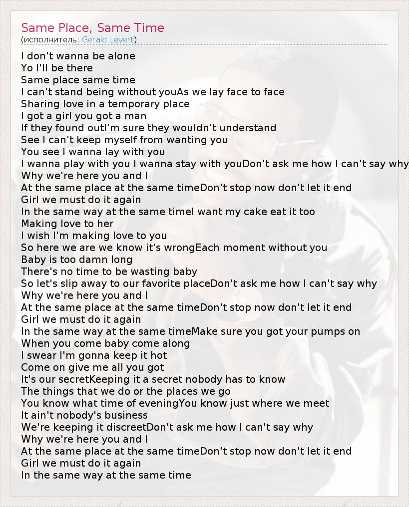 I don't wanna be alone Yo I'll be there Same place same time I can't stand being without youAs we lay face to face Sharing love in a temporary place I got a girl you got a man If they found outI'm sure they wouldn't understand See I can't keep myself from wanting you You see I wanna lay with you I wanna play with you I wanna stay with youDon't ask me how I can't say why Why we're here you and I At the same place at the same timeDon't stop now don't let it end Girl we must do it again In the same way at the same timeI want my cake eat it too Making love to her I wish I'm making love to you So here we are we know it's wrongEach moment without you Baby is too damn long There's no time to be wasting baby So let's slip away to our favorite placeDon't ask me how I can't say why Why we're here you and I At the same place at the same timeDon't stop now don't let it end Girl we must do it again In the same way at the same timeMake sure you got your pumps on When you come baby come along I swear I'm gonna keep it hot Come on give me all you got It's our secretKeeping it a secret nobody has to know The things that we do or the places we go You know what time of eveningYou know just where we meet It ain't nobody's business We're keeping it discreetDon't ask me how I can't say why Why we're here you and I At the same place at the same timeDon't stop now don't let it end Girl we must do it again In the same way at the same time