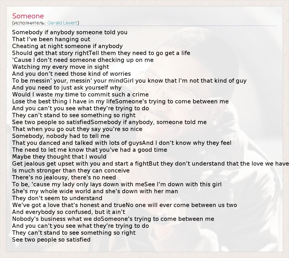 Somebody if anybody someone told you That I've been hanging out Cheating at night someone if anybody Should get that story rightTell them they need to go get a life 'Cause I don't need someone dhecking up on me Watching my every move in sight And you don't need those kind of worries To be messin' your, messin' your mindGirl you know that I'm not that kind of guy And you need to just ask yourself why Would I waste my time to commit such a crime Lose the best thing I have in my lifeSomeone's trying to come between me And you can't you see what they're trying to do They can't stand to see something so right See two people so satisfiedSomebody if anybody, someone told me That when you go out they say you're so nice Somebody, nobody had to tell me That you danced and talked with lots of guysAnd I don't know why they feel The need to let me know that you've had a good time Maybe they thought that I would Get jealous get upset with you and start a fightBut they don't understand that the love we have Is much stronger than they can conceive There's no jealousy, there's no need To be, 'cause my lady only lays down with meSee I'm down with this girl She's my whole wide world and she's down with her man They don't seem to understand We've got a love that's honest and trueNo one will ever come between us two And everybody so confused, but it ain't Nobody's business what we doSomeone's trying to come between me And you can't you see what they're trying to do They can't stand to see something so right See two people so satisfied