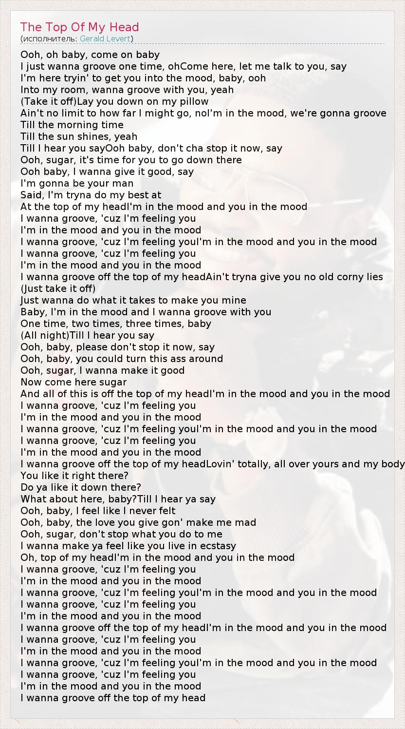 Ooh, oh baby, come on baby I just wanna groove one time, ohCome here, let me talk to you, say I'm here tryin' to get you into the mood, baby, ooh Into my room, wanna groove with you, yeah (Take it off)Lay you down on my pillow Ain't no limit to how far I might go, noI'm in the mood, we're gonna groove Till the morning time Till the sun shines, yeah Till I hear you sayOoh baby, don't cha stop it now, say Ooh, sugar, it's time for you to go down there Ooh baby, I wanna give it good, say I'm gonna be your man Said, I'm tryna do my best at At the top of my headI'm in the mood and you in the mood I wanna groove, 'cuz I'm feeling you I'm in the mood and you in the mood I wanna groove, 'cuz I'm feeling youI'm in the mood and you in the mood I wanna groove, 'cuz I'm feeling you I'm in the mood and you in the mood I wanna groove off the top of my headAin't tryna give you no old corny lies (Just take it off) Just wanna do what it takes to make you mine Baby, I'm in the mood and I wanna groove with you One time, two times, three times, baby (All night)Till I hear you say Ooh, baby, please don't stop it now, say Ooh, baby, you could turn this ass around Ooh, sugar, I wanna make it good Now come here sugar And all of this is off the top of my headI'm in the mood and you in the mood I wanna groove, 'cuz I'm feeling you I'm in the mood and you in the mood I wanna groove, 'cuz I'm feeling youI'm in the mood and you in the mood I wanna groove, 'cuz I'm feeling you I'm in the mood and you in the mood I wanna groove off the top of my headLovin' totally, all over yours and my body You like it right there? Do ya like it down there? What about here, baby?Till I hear ya say Ooh, baby, I feel like I never felt Ooh, baby, the love you give gon' make me mad Ooh, sugar, don't stop what you do to me I wanna make ya feel like you live in ecstasy Oh, top of my headI'm in the mood and you in the mood I wanna groove, 'cuz I'm feeling you I'm in the mood and you in the mood I wanna groove, 'cuz I'm feeling youI'm in the mood and you in the mood I wanna groove, 'cuz I'm feeling you I'm in the mood and you in the mood I wanna groove off the top of my headI'm in the mood and you in the mood I wanna groove, 'cuz I'm feeling you I'm in the mood and you in the mood I wanna groove, 'cuz I'm feeling youI'm in the mood and you in the mood I wanna groove, 'cuz I'm feeling you I'm in the mood and you in the mood I wanna groove off the top of my head