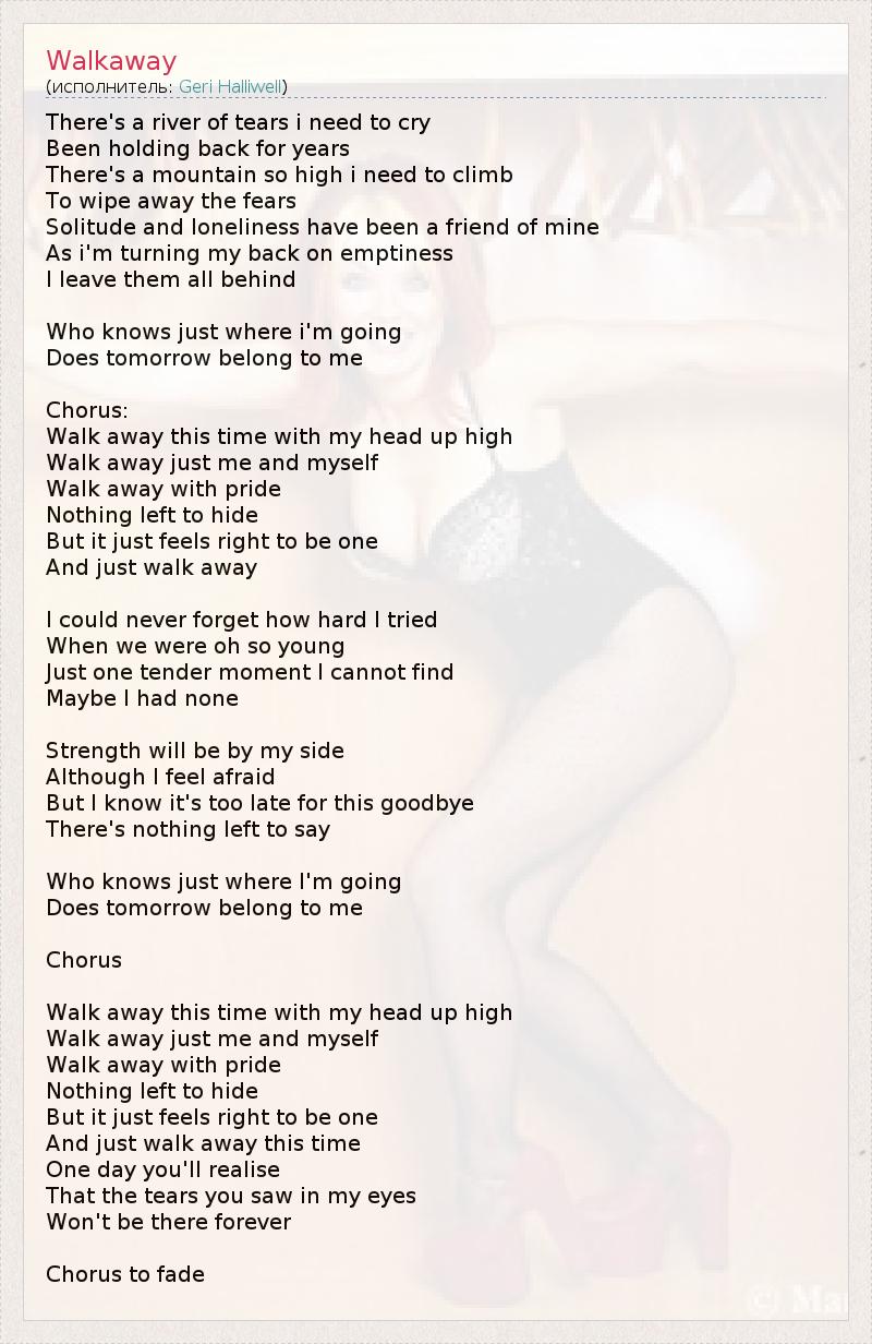 There's a river of tears i need to cry Been holding back for years There's a mountain so high i need to climb To wipe away the fears Solitude and loneliness have been a friend of mine As i'm turning my back on emptiness I leave them all behind Who knows just where i'm going Does tomorrow belong to me Chorus: Walk away this time with my head up high Walk away just me and myself Walk away with pride Nothing left to hide But it just feels right to be one And just walk away I could never forget how hard I tried When we were oh so young Just one tender moment I cannot find Maybe I had none Strength will be by my side Although I feel afraid But I know it's too late for this goodbye There's nothing left to say Who knows just where I'm going Does tomorrow belong to me Chorus Walk away this time with my head up high Walk away just me and myself Walk away with pride Nothing left to hide But it just feels right to be one And just walk away this time One day you'll realise That the tears you saw in my eyes Won't be there forever Chorus to fade