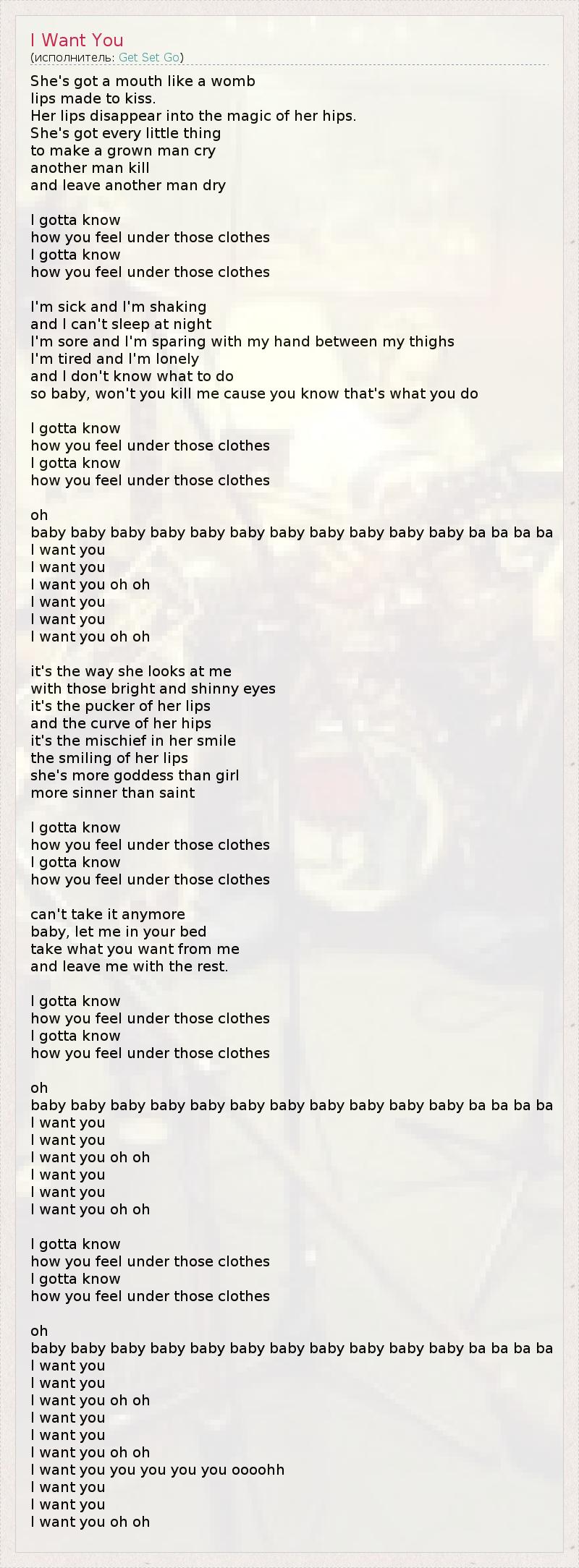 She's got a mouth like a womb lips made to kiss. Her lips disappear into the magic of her hips. She's got every little thing to make a grown man cry another man kill and leave another man dry I gotta know how you feel under those clothes I gotta know how you feel under those clothes I'm sick and I'm shaking and I can't sleep at night I'm sore and I'm sparing with my hand between my thighs I'm tired and I'm lonely and I don't know what to do so baby, won't you kill me cause you know that's what you do I gotta know how you feel under those clothes I gotta know how you feel under those clothes oh baby baby baby baby baby baby baby baby baby baby baby ba ba ba ba I want you I want you I want you oh oh I want you I want you I want you oh oh it's the way she looks at me with those bright and shinny eyes it's the pucker of her lips and the curve of her hips it's the mischief in her smile the smiling of her lips she's more goddess than girl more sinner than saint I gotta know how you feel under those clothes I gotta know how you feel under those clothes can't take it anymore baby, let me in your bed take what you want from me and leave me with the rest. I gotta know how you feel under those clothes I gotta know how you feel under those clothes oh baby baby baby baby baby baby baby baby baby baby baby ba ba ba ba I want you I want you I want you oh oh I want you I want you I want you oh oh I gotta know how you feel under those clothes I gotta know how you feel under those clothes oh baby baby baby baby baby baby baby baby baby baby baby ba ba ba ba I want you I want you I want you oh oh I want you I want you I want you oh oh I want you you you you you oooohh I want you I want you I want you oh oh