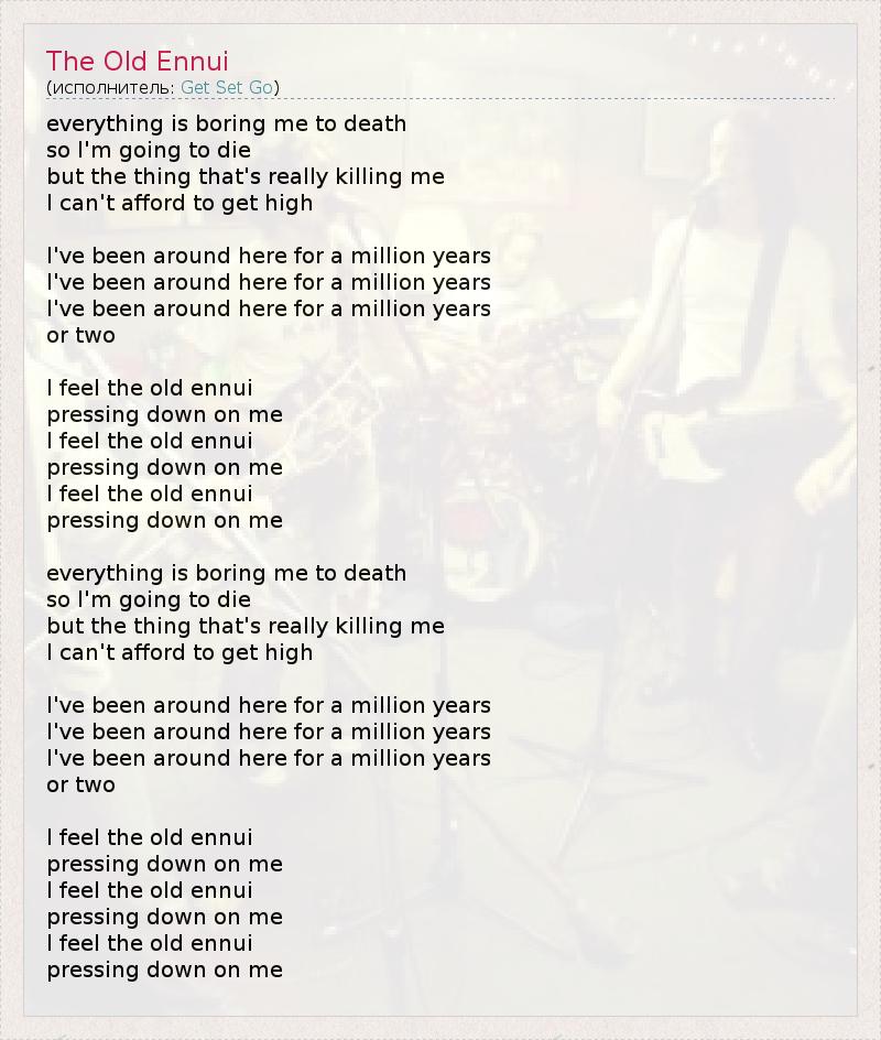 everything is boring me to death so I'm going to die but the thing that's really killing me I can't afford to get high I've been around here for a million years I've been around here for a million years I've been around here for a million years or two I feel the old ennui pressing down on me I feel the old ennui pressing down on me I feel the old ennui pressing down on me everything is boring me to death so I'm going to die but the thing that's really killing me I can't afford to get high I've been around here for a million years I've been around here for a million years I've been around here for a million years or two I feel the old ennui pressing down on me I feel the old ennui pressing down on me I feel the old ennui pressing down on me