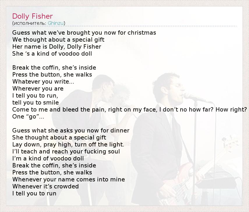 Guess what we’ve brought you now for christmas We thought about a special gift Her name is Dolly, Dolly Fisher She ‘s a kind of voodoo doll Break the coffin, she’s inside Press the button, she walks Whatever you write... Wherever you are I tell you to run, tell you to smile Come to me and bleed the pain, right on my face, I don’t no how far? How right? One “go”... Guess what she asks you now for dinner She thought about a special gift Lay down, pray high, turn off the light. I’ll teach and reach your fucking soul I’m a kind of voodoo doll Break the coffin, she’s inside Press the button, she walks Whenever your name comes into mine Whenever it’s crowded I tell you to run