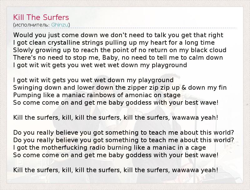Would you just come down we don't need to talk you get that right I got clean crystalline strings pulling up my heart for a long time Slowly growing up to reach the point of no return on my black cloud There's no need to stop me, Baby, no need to tell me to calm down I got wit wit gets you wet wet wet down my playground I got wit wit gets you wet wet down my playground Swinging down and lower down the zipper zip zip up & down my fin Pumping like a maniac rainbows of amoniac on stage So come come on and get me baby goddess with your best wave! Kill the surfers, kill, kill the surfers, kill the surfers, wawawa yeah! Do you really believe you got something to teach me about this world? Do you really believe you got something to teach me about this world? I got the motherfucking radio burning like a maniac in a cage So come come on and get me baby goddess with your best wave! Kill the surfers, kill, kill the surfers, kill the surfers, wawawa yeah!