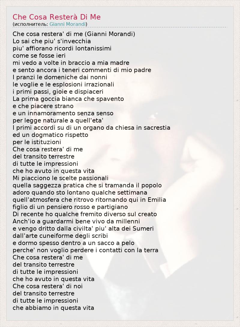 Che cosa restera' di me (Gianni Morandi) Lo sai che piu' s'invecchia piu' affiorano ricordi lontanissimi come se fosse ieri mi vedo a volte in braccio a mia madre e sento ancora i teneri commenti di mio padre I pranzi le domeniche dai nonni le voglie e le esplosioni irrazionali i primi passi, gioie e dispiaceri La prima goccia bianca che spavento e che piacere strano e un innamoramento senza senso per legge naturale a quell'eta' I primi accordi su di un organo da chiesa in sacrestia ed un dogmatico rispetto per le istituzioni Che cosa restera' di me del transito terrestre di tutte le impressioni che ho avuto in questa vita Mi piacciono le scelte passionali quella saggezza pratica che si tramanda il popolo adoro quando sto lontano qualche settimana quell'atmosfera che ritrovo ritornando qui in Emilia figlio di un pensiero rosso e partigiano Di recente ho qualche fremito diverso sul creato Anch'io a guardarmi bene vivo da millenni e vengo dritto dalla civilta' piu' alta dei Sumeri dall'arte cuneiforme degli scribi e dormo spesso dentro a un sacco a pelo perche' non voglio perdere i contatti con la terra Che cosa restera' di me del transito terrestre di tutte le impressioni che ho avuto in questa vita Che cosa restera' di noi del transito terrestre di tutte le impressioni che abbiamo in questa vita
