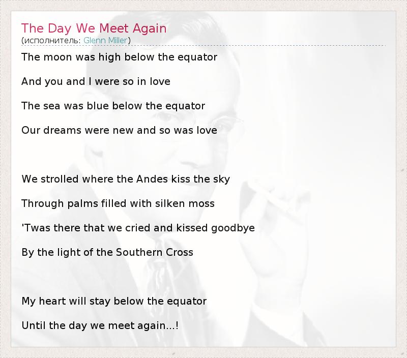 The moon was high below the equator And you and I were so in love The sea was blue below the equator Our dreams were new and so was love We strolled where the Andes kiss the sky Through palms filled with silken moss 'Twas there that we cried and kissed goodbye By the light of the Southern Cross My heart will stay below the equator Until the day we meet again...!