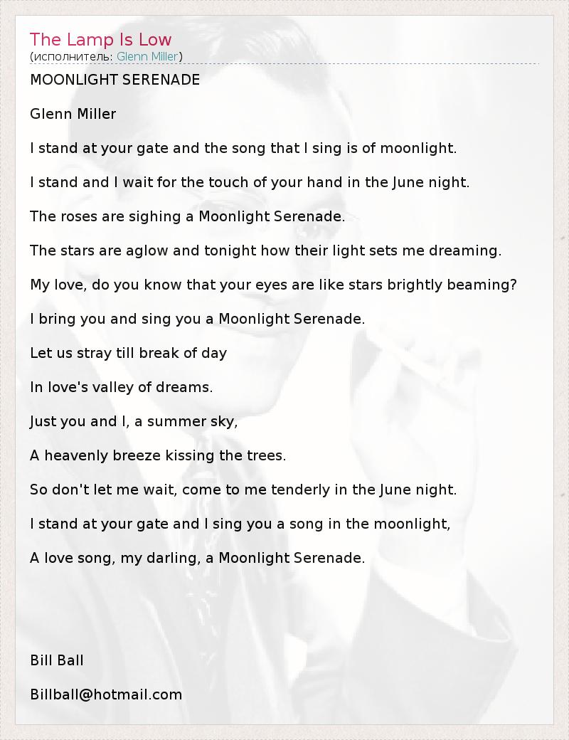 MOONLIGHT SERENADE Glenn Miller I stand at your gate and the song that I sing is of moonlight. I stand and I wait for the touch of your hand in the June night. The roses are sighing a Moonlight Serenade. The stars are aglow and tonight how their light sets me dreaming. My love, do you know that your eyes are like stars brightly beaming? I bring you and sing you a Moonlight Serenade. Let us stray till break of day In love's valley of dreams. Just you and I, a summer sky, A heavenly breeze kissing the trees. So don't let me wait, come to me tenderly in the June night. I stand at your gate and I sing you a song in the moonlight, A love song, my darling, a Moonlight Serenade. Bill Ball Billball@hotmail.com