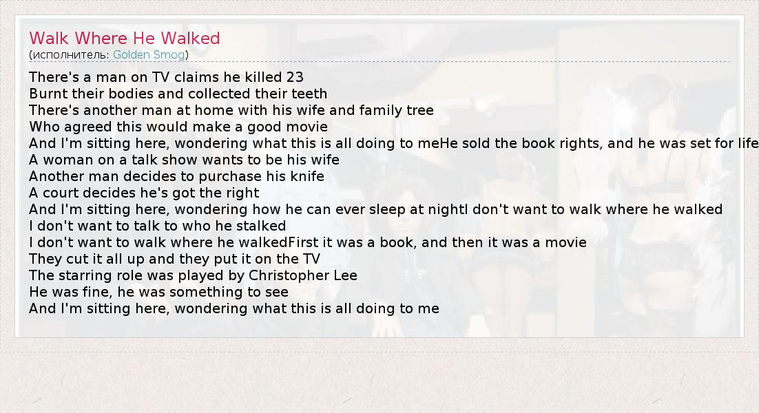 There's a man on TV claims he killed 23 Burnt their bodies and collected their teeth There's another man at home with his wife and family tree Who agreed this would make a good movie And I'm sitting here, wondering what this is all doing to meHe sold the book rights, and he was set for life A woman on a talk show wants to be his wife Another man decides to purchase his knife A court decides he's got the right And I'm sitting here, wondering how he can ever sleep at nightI don't want to walk where he walked I don't want to talk to who he stalked I don't want to walk where he walkedFirst it was a book, and then it was a movie They cut it all up and they put it on the TV The starring role was played by Christopher Lee He was fine, he was something to see And I'm sitting here, wondering what this is all doing to me