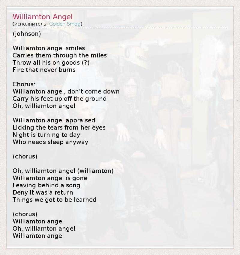 (johnson) Williamton angel smiles Carries them through the miles Throw all his on goods (?) Fire that never burns Chorus: Williamton angel, don't come down Carry his feet up off the ground Oh, williamton angel Williamton angel appraised Licking the tears from her eyes Night is turning to day Who needs sleep anyway (chorus) Oh, williamton angel (williamton) Williamton angel is gone Leaving behind a song Deny it was a return Things we got to be learned (chorus) Williamton angel Oh, williamton angel Williamton angel