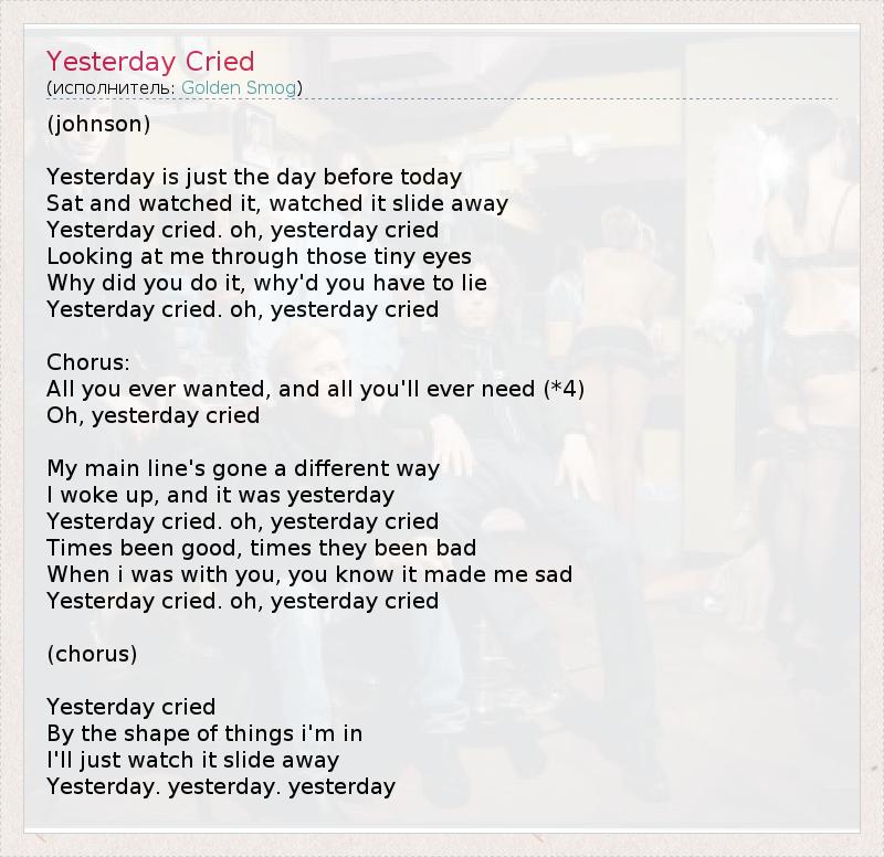 (johnson) Yesterday is just the day before today Sat and watched it, watched it slide away Yesterday cried. oh, yesterday cried Looking at me through those tiny eyes Why did you do it, why'd you have to lie Yesterday cried. oh, yesterday cried Chorus: All you ever wanted, and all you'll ever need (*4) Oh, yesterday cried My main line's gone a different way I woke up, and it was yesterday Yesterday cried. oh, yesterday cried Times been good, times they been bad When i was with you, you know it made me sad Yesterday cried. oh, yesterday cried (chorus) Yesterday cried By the shape of things i'm in I'll just watch it slide away Yesterday. yesterday. yesterday