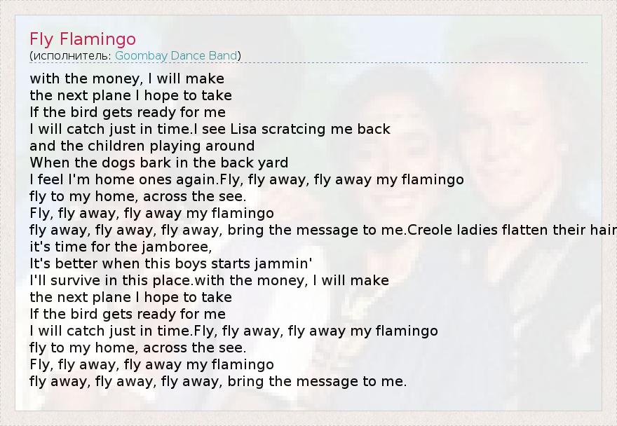 with the money, I will make the next plane I hope to take If the bird gets ready for me I will catch just in time.I see Lisa scratcing me back and the children playing around When the dogs bark in the back yard I feel I'm home ones again.Fly, fly away, fly away my flamingo fly to my home, across the see. Fly, fly away, fly away my flamingo fly away, fly away, fly away, bring the message to me.Creole ladies flatten their hair it's time for the jamboree, It's better when this boys starts jammin' I'll survive in this place.with the money, I will make the next plane I hope to take If the bird gets ready for me I will catch just in time.Fly, fly away, fly away my flamingo fly to my home, across the see. Fly, fly away, fly away my flamingo fly away, fly away, fly away, bring the message to me.