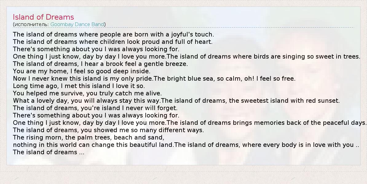 The island of dreams where people are born with a joyful's touch. The island of dreams where children look proud and full of heart. There's something about you I was always looking for. One thing I just know, day by day I love you more.The island of dreams where birds are singing so sweet in trees. The island of dreams, I hear a brook feel a gentle breeze. You are my home, I feel so good deep inside. Now I never knew this island is my only pride.The bright blue sea, so calm, oh! I feel so free. Long time ago, I met this island I love it so. You helped me survive, you truly catch me alive. What a lovely day, you will always stay this way.The island of dreams, the sweetest island with red sunset. The island of dreams, you're island I never will forget. There's something about you I was always looking for. One thing I just know, day by day I love you more.The island of dreams brings memories back of the peaceful days. The island of dreams, you showed me so many different ways. The rising morn, the palm trees, beach and sand, nothing in this world can change this beautiful land.The island of dreams, where every body is in love with you .. The island of dreams ...