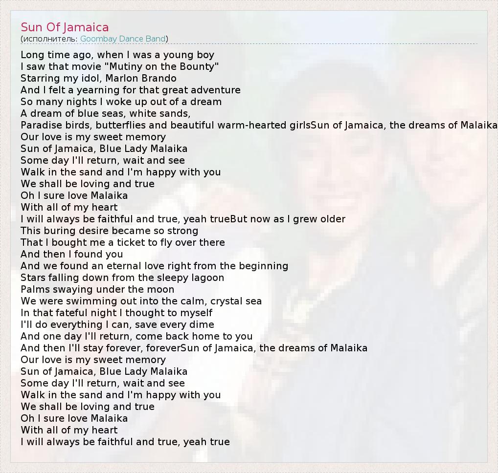 А как ты думаешь, о чем песня "Sun Of Jamaica" ?