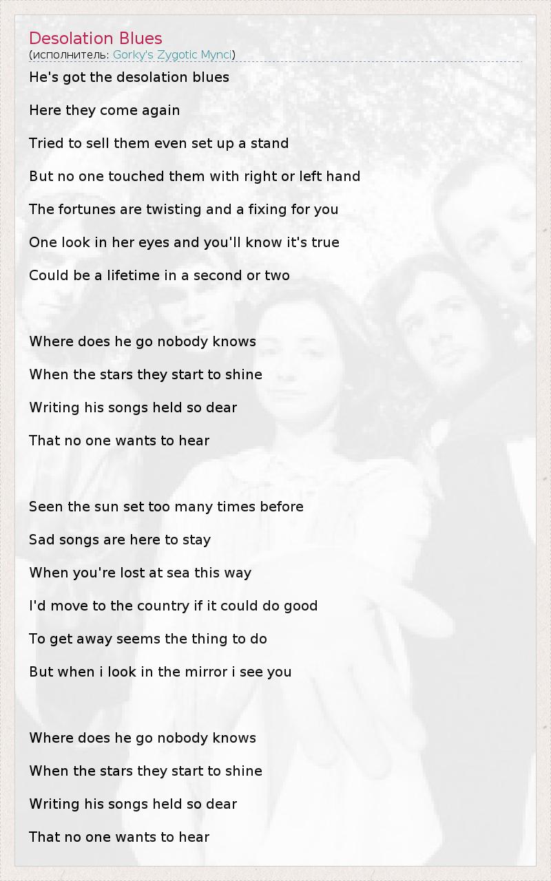 He's got the desolation blues Here they come again Tried to sell them even set up a stand But no one touched them with right or left hand The fortunes are twisting and a fixing for you One look in her eyes and you'll know it's true Could be a lifetime in a second or two Where does he go nobody knows When the stars they start to shine Writing his songs held so dear That no one wants to hear Seen the sun set too many times before Sad songs are here to stay When you're lost at sea this way I'd move to the country if it could do good To get away seems the thing to do But when i look in the mirror i see you Where does he go nobody knows When the stars they start to shine Writing his songs held so dear That no one wants to hear