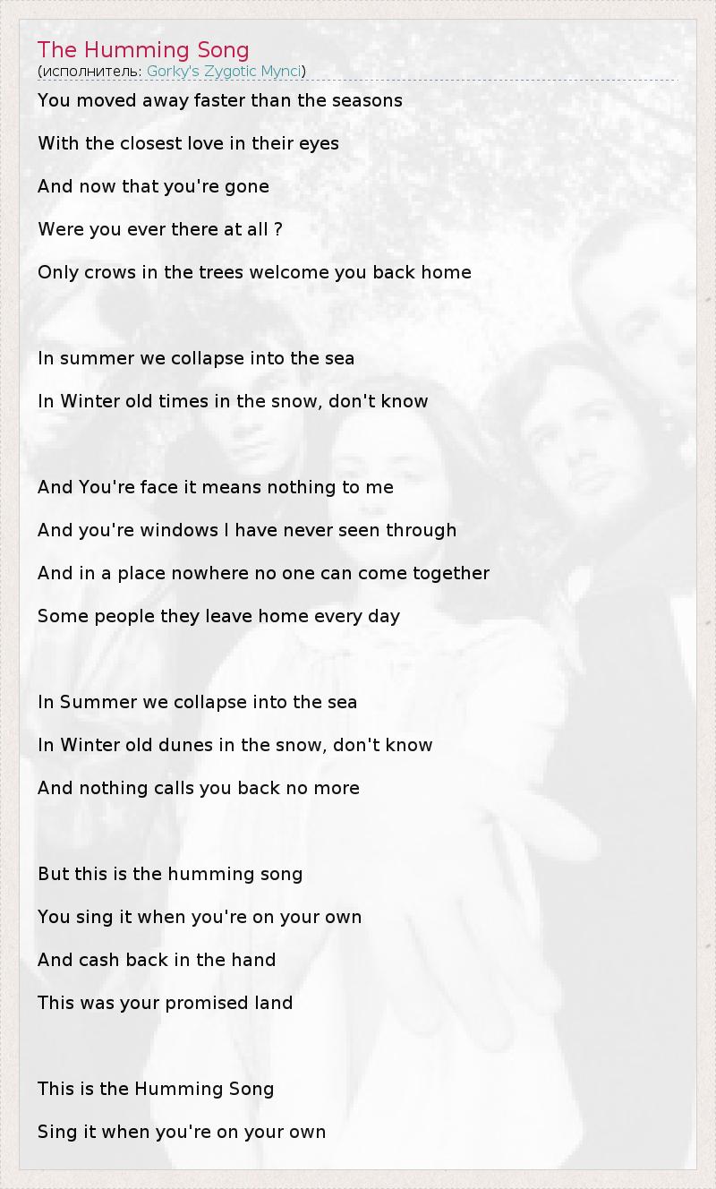You moved away faster than the seasons With the closest love in their eyes And now that you're gone Were you ever there at all ? Only crows in the trees welcome you back home In summer we collapse into the sea In Winter old times in the snow, don't know And You're face it means nothing to me And you're windows I have never seen through And in a place nowhere no one can come together Some people they leave home every day In Summer we collapse into the sea In Winter old dunes in the snow, don't know And nothing calls you back no more But this is the humming song You sing it when you're on your own And cash back in the hand This was your promised land This is the Humming Song Sing it when you're on your own